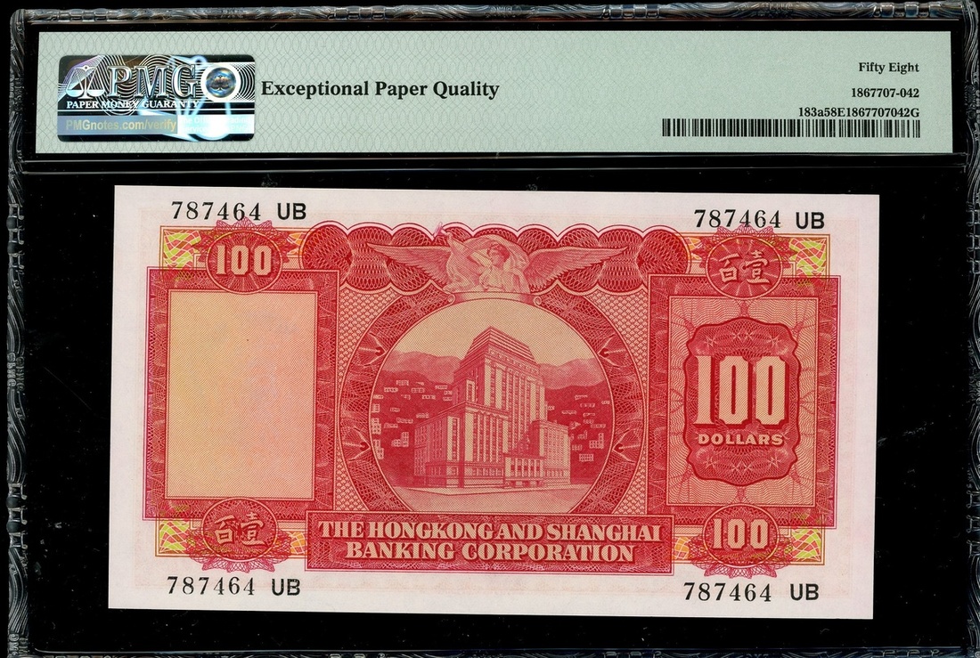 1959年香港匯豐銀行100元,編號 787464UB,PMG 58EPQ