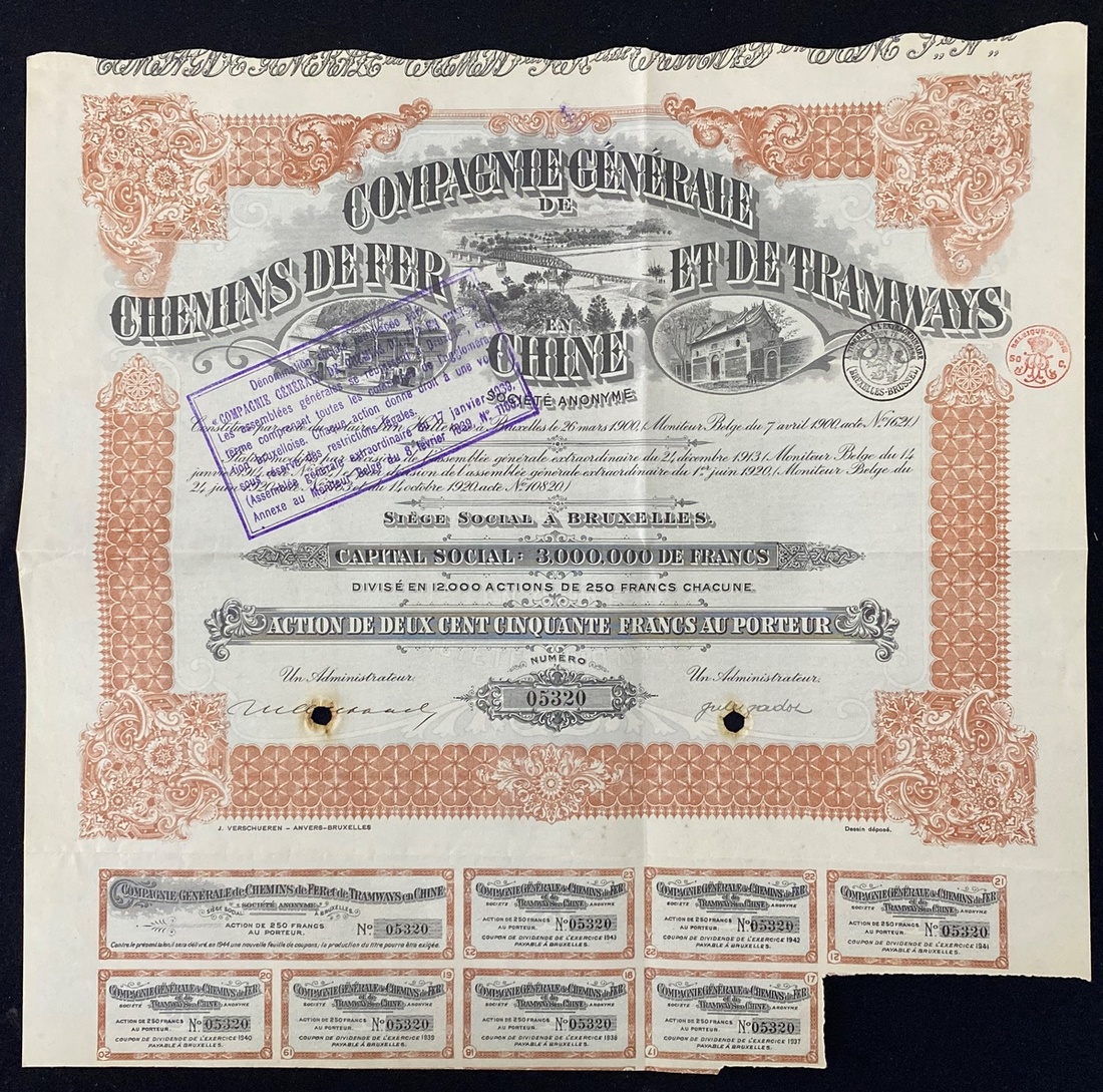 General Company of Railways and Tramways in China, bond for 250 Francs, 1920, number 05320, good very fine, punch hole cancelled, with coupons attached