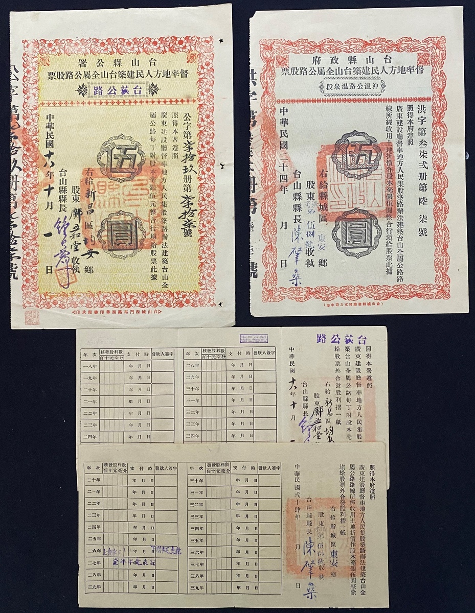 Tai Shan County Office, 2 sets of 5 yuan shares cerfiticate with dividend booklet, 5 Yuan shares cerfiticate for the construction of the Tai Chi Highway, 1929 and Wen Quan Section of Chong Wen Highway, 1935,