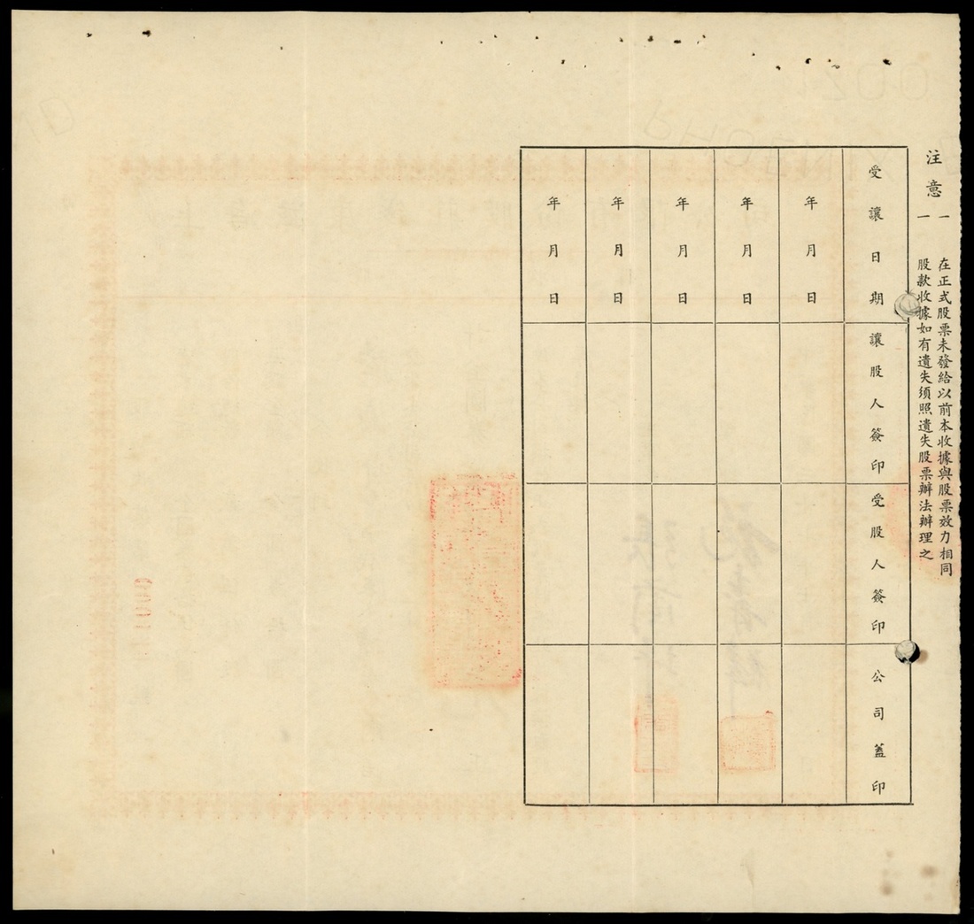 Shanghai Zikang Bank, a payment receipt of $1000 for 100 shares, Year 37 (1938), serial number 000139, extremely fine with staple holes