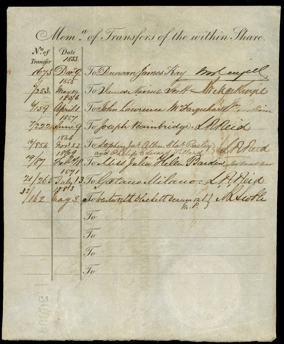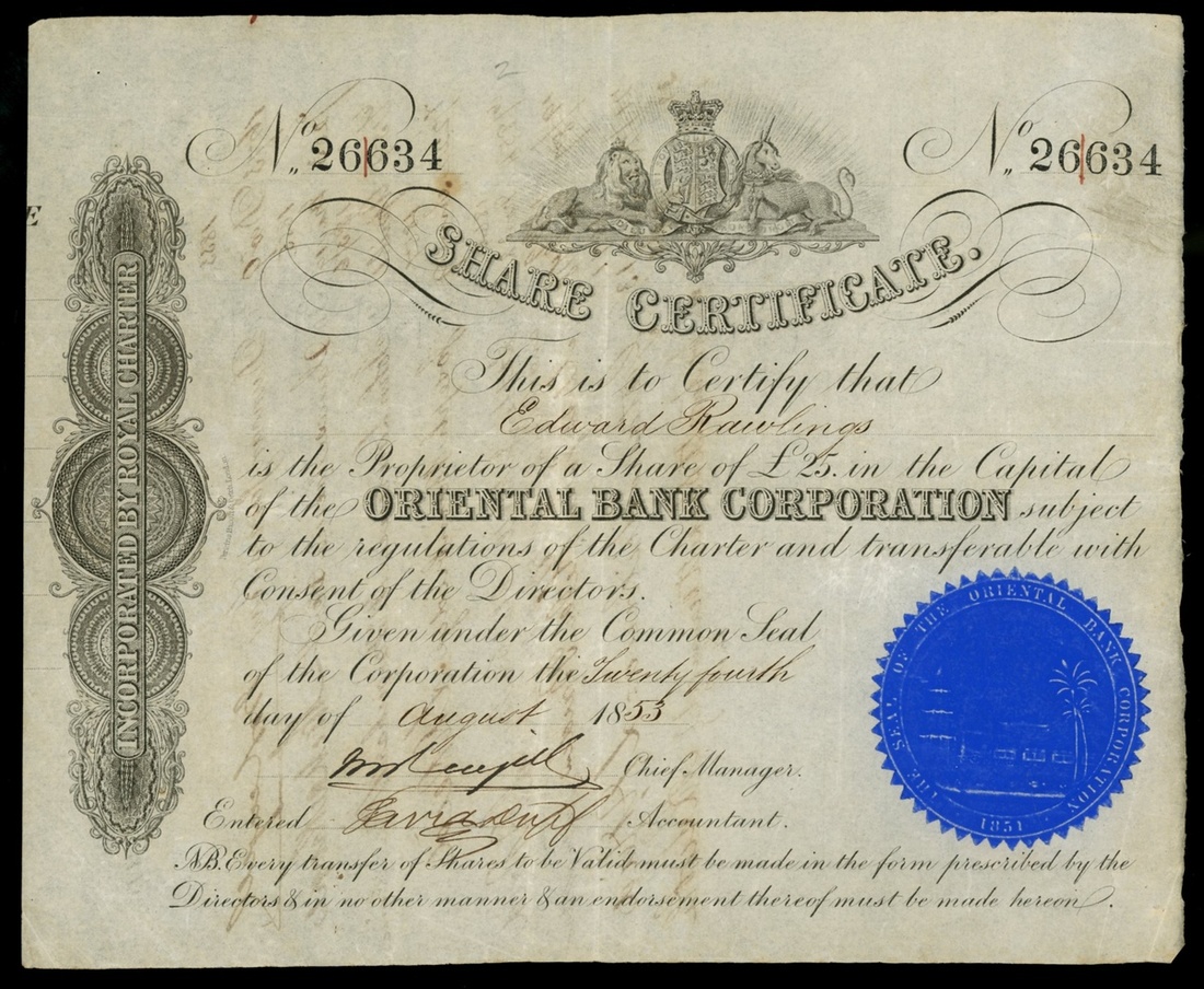 Oriental Bank Corporation, a shares certificate for 25 pounds, 1853, serial number 266634, extremely fine with foxing