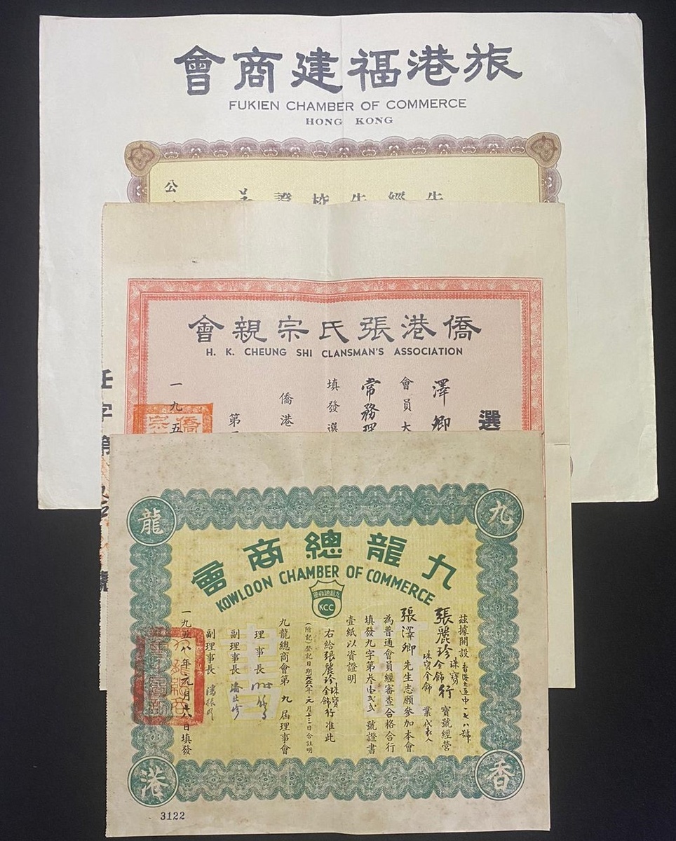 香港證書一組3枚包括1954年旅港福建商會,1958年九龍總商會,及1954年僑港張氏宗親會,EF或以上品相,保存完好