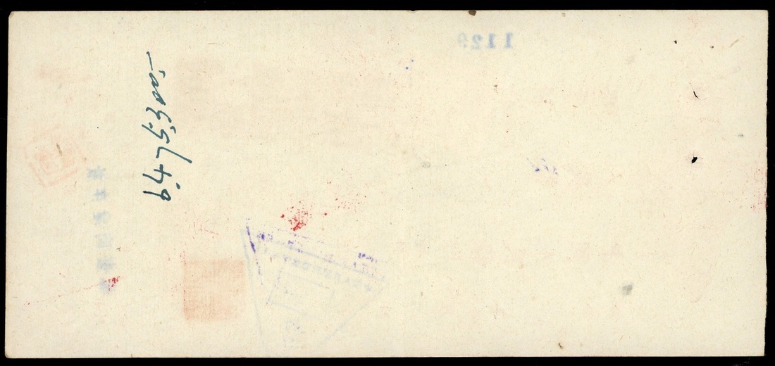 People's Bank of China, cashier's cheque for 50,000 Yuan, 1953, cheque number 0577175, vertical format, various stamp marks including wartime slogans during the Korean War,