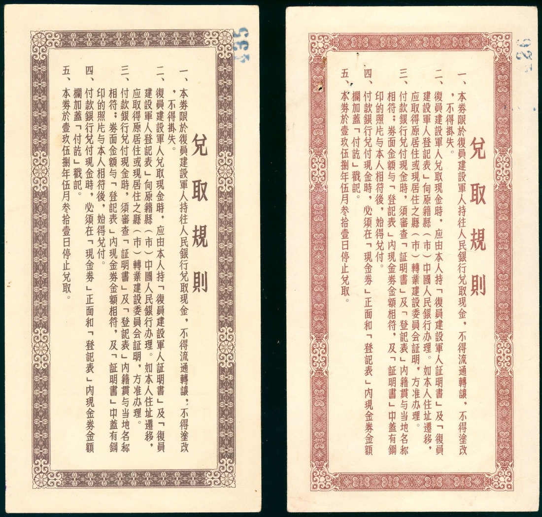 1956年中國人民銀行復員建設軍人生產資助金兌取現金券2枚,分別50及100元,前者AU,後者AEF品相
