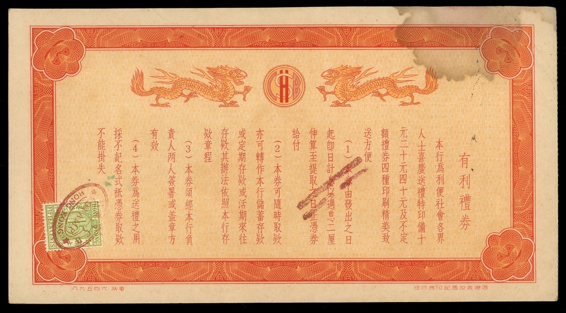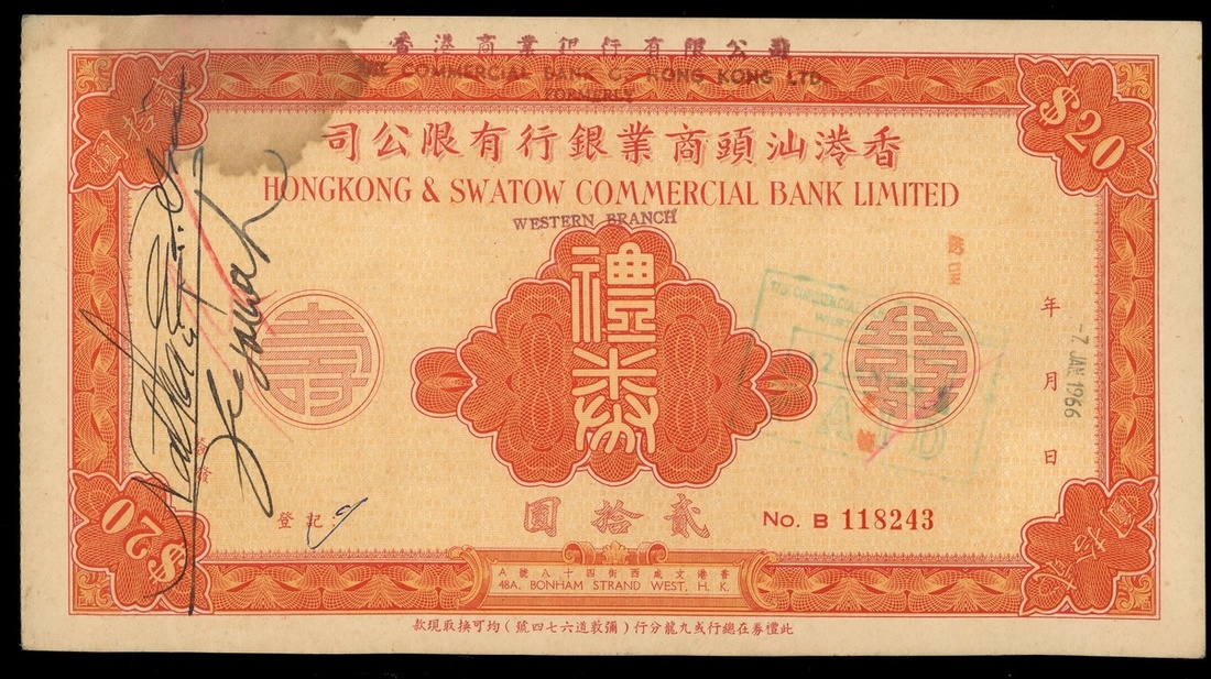 Hongkong and Swatow Commercial Bank, gift coupon for $20, 1966, serial number B118243, chopmark overprints, stamp duty at reverse lower left,