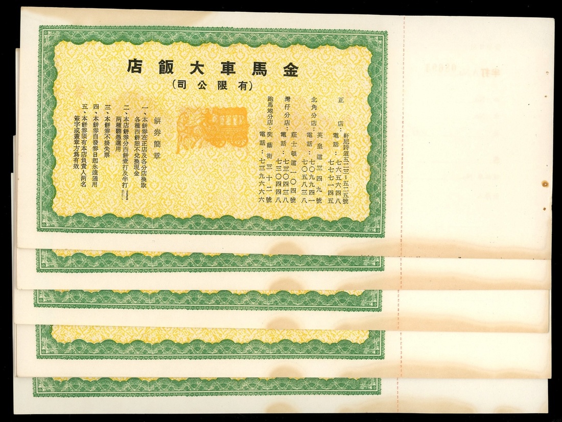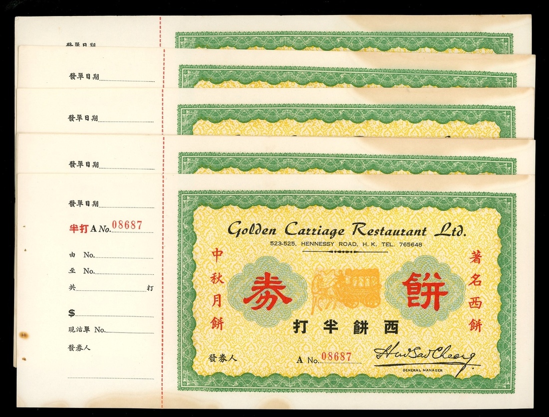 Hong Kong, Golden Carriage Restaurant, group of 8x exchange vouchers for half a dozen of cakes, consecutive serial numbers 08687-94 about uncirculated with stains (8).