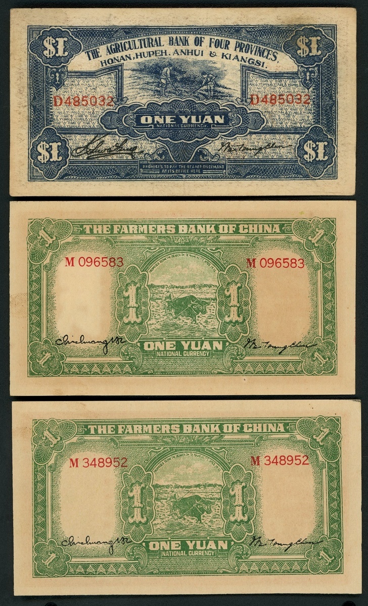 民國紙鈔一組3枚,包括民國二十二年四省農民銀行1元,及中國農民銀行民國三十三年1元一對,三枚均為老假票,編號D485032,M096583 及M348952,首枚AU,其餘2枚UNC,保存完好,印刷精美