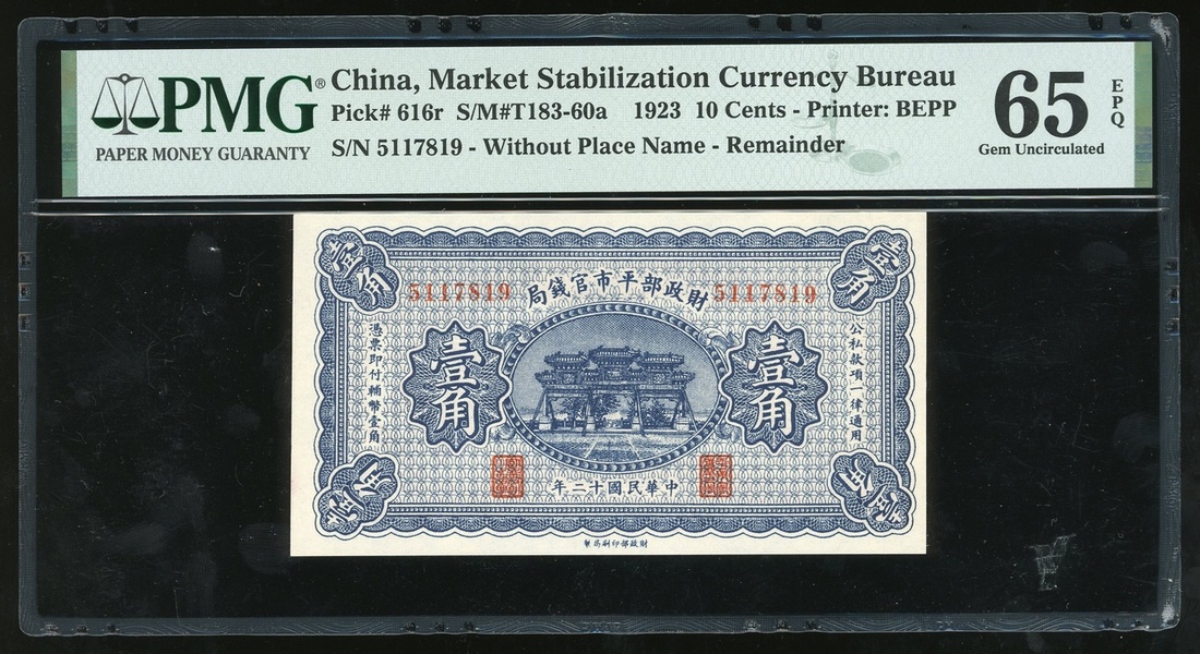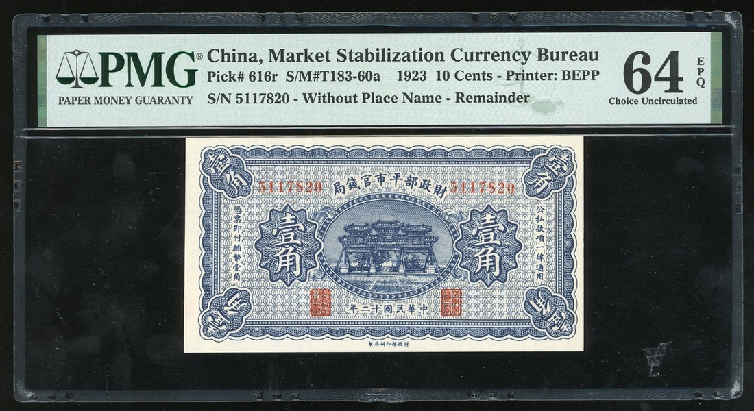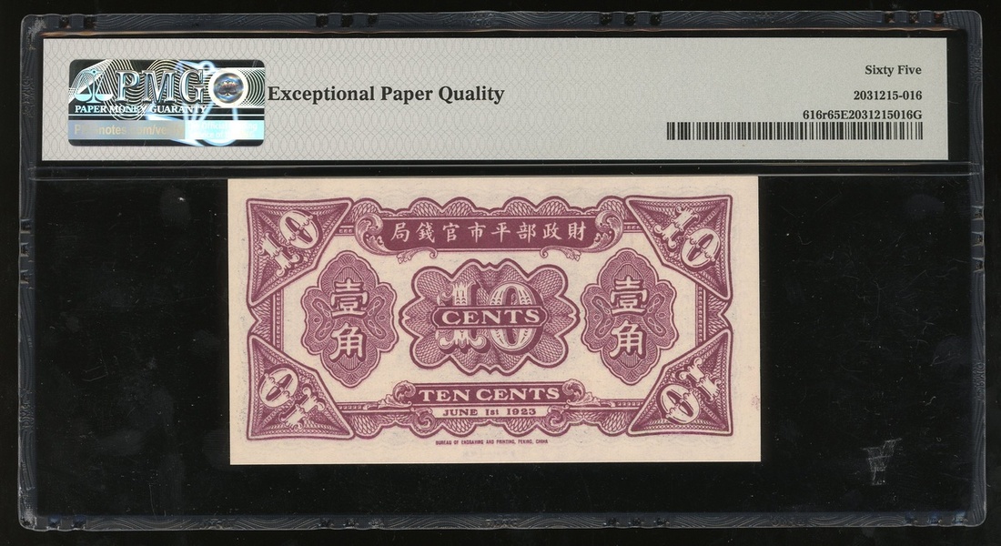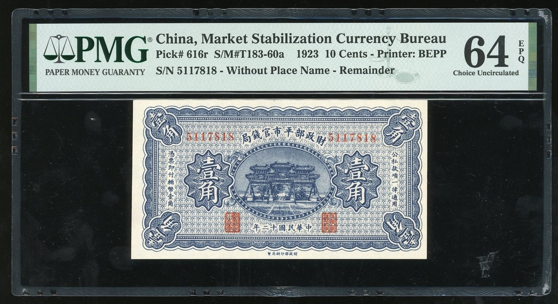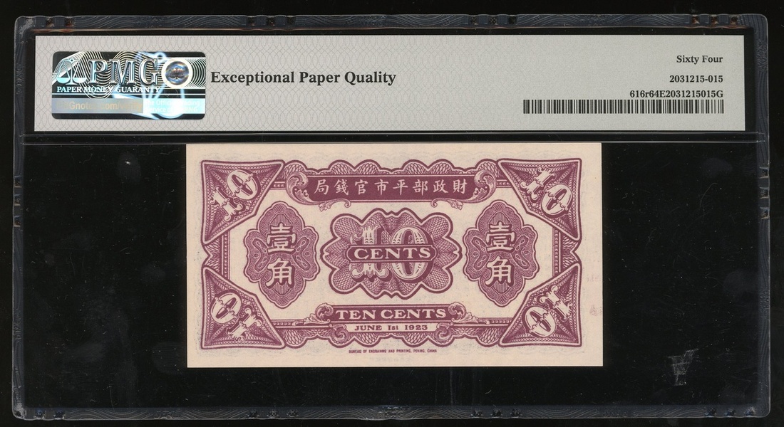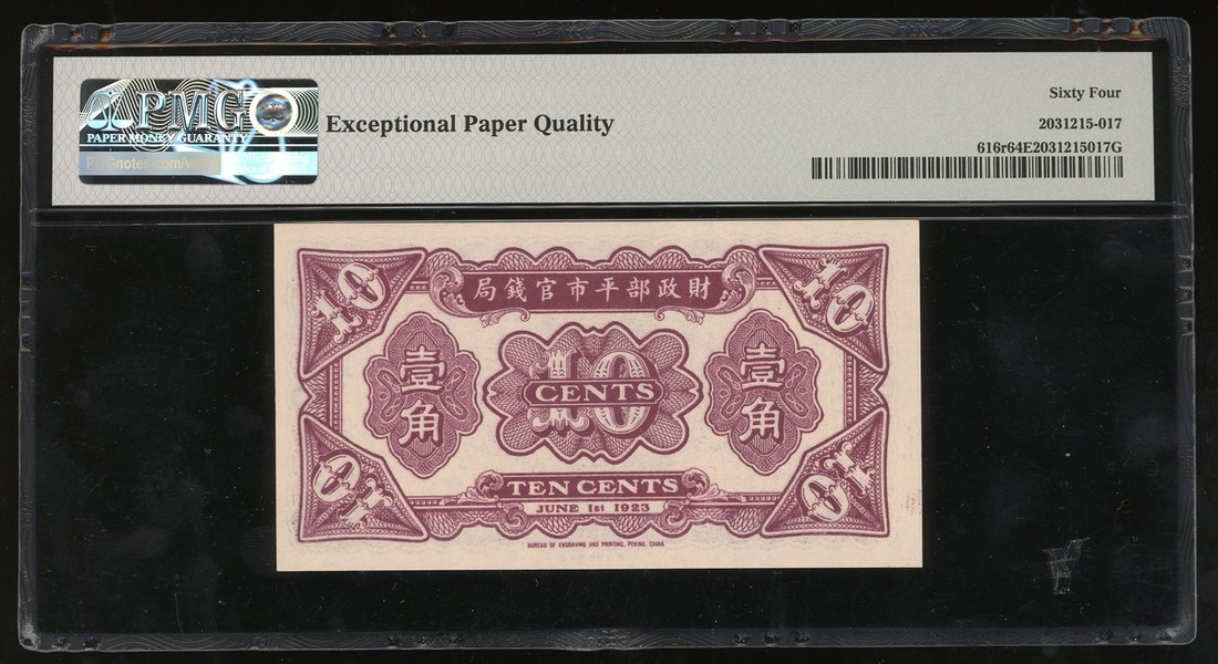 民國十二年財政部平市官錢局1角連號三枚,皆為庫存票,5117818-820,PMG 64EPQ-65EPQ