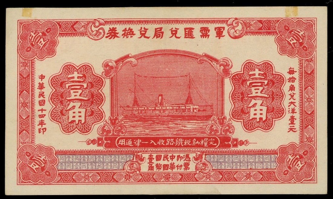 民國十四年軍需匯兌司兌換券1角,庫存票,上方有膠貼痕跡,UNC,有黃,罕見版別