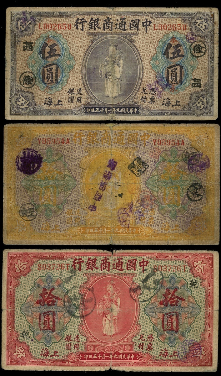 民國九年中國通商銀行一組3枚,5元1枚及10元2枚,上海地名,編號L002650,S03726T,及Y05954A,VG至F品相