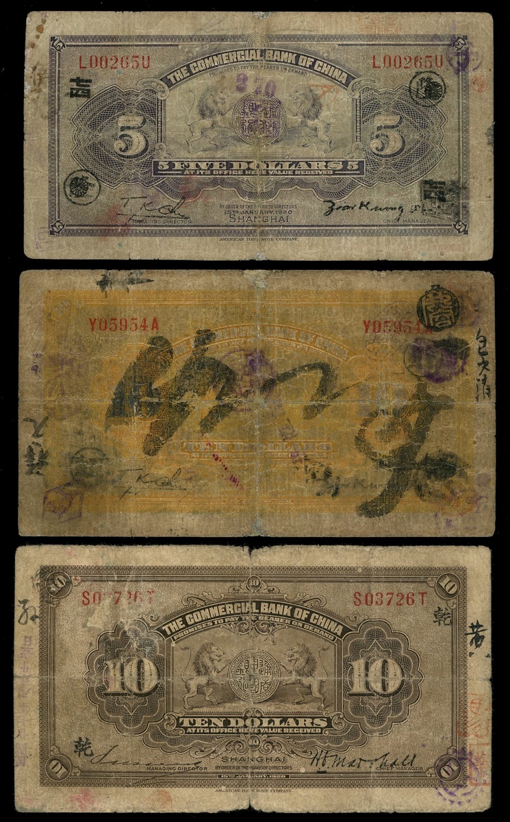 The Commercial Bank of China, a lot of $5 and 2x $10, Shanghai, 1920, serial number L002650, S03726T, Y05954A, purple, red and yellow respectively,