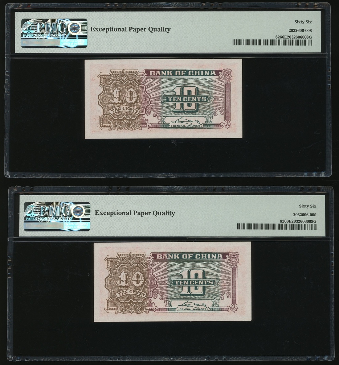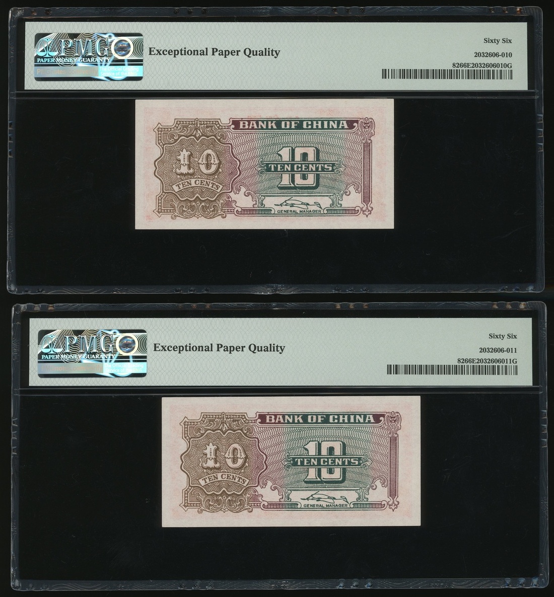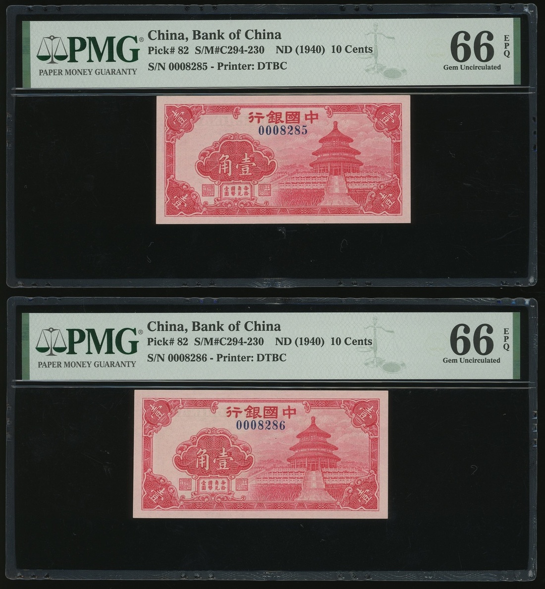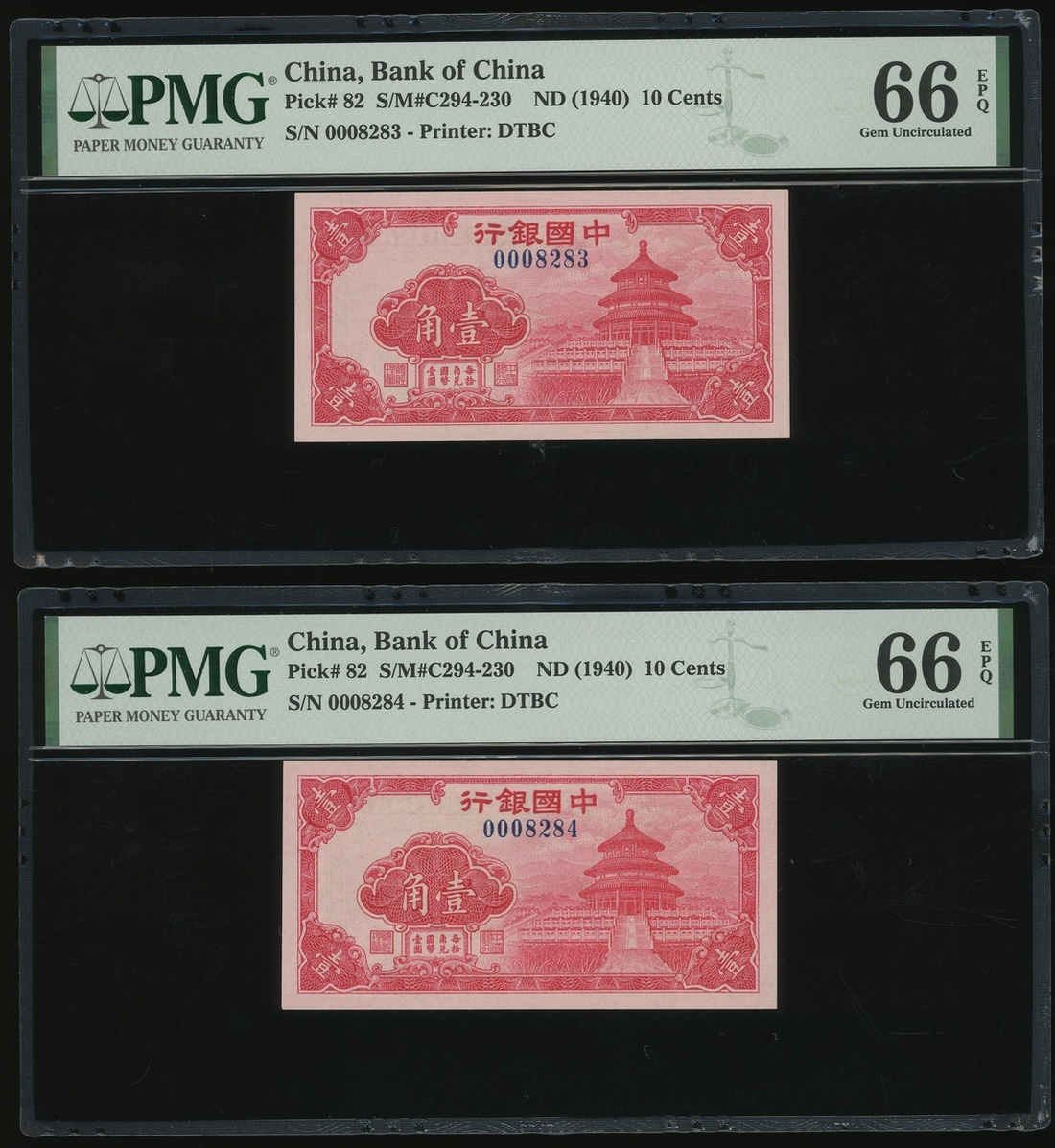 Bank of China, 4x 10 cents, ND (1940), serial number 0008283-286, (Pick 82), all graded PMG 66EPQ Gem Uncirculated (4)