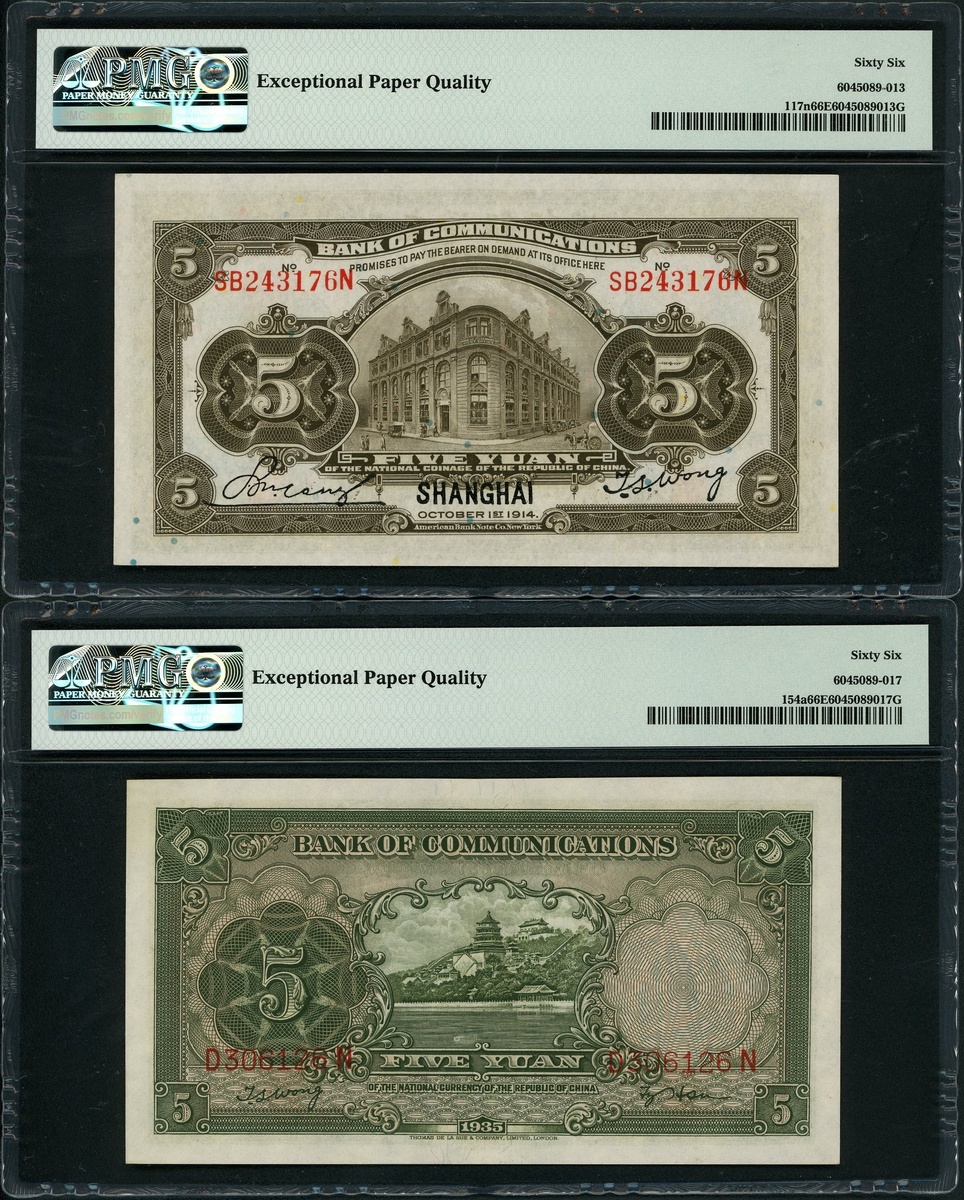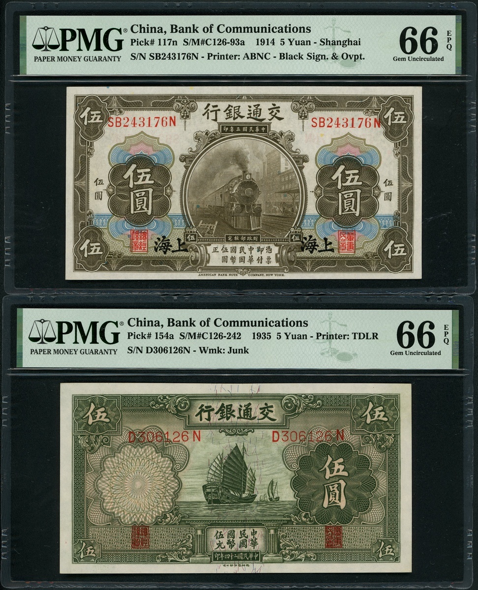 Bank of Communications, a pair of 5 Yuan, Shanghai, 1914 and 1935, serial numbers SB243176N and D306126N, (Pick 117n, 154a), both graded PMG 66EPQ Gem Uncirculated (2)