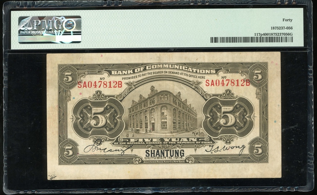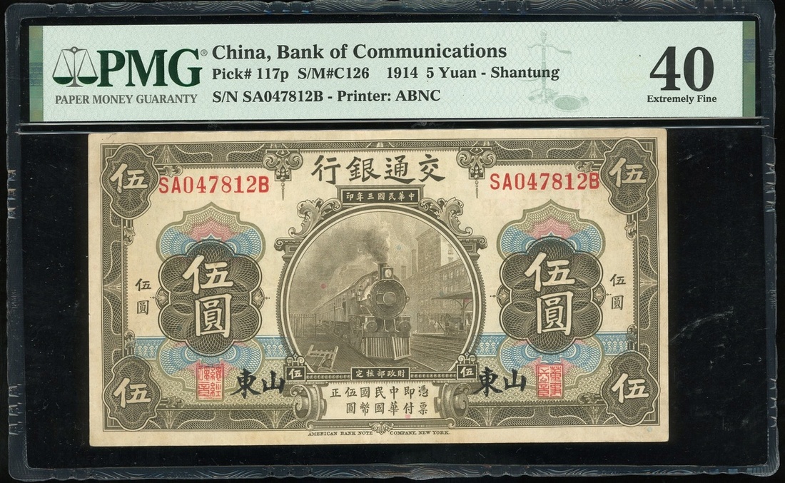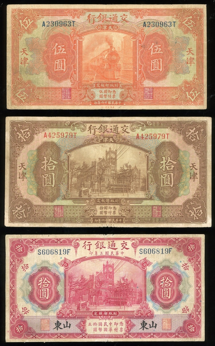 民國三年(1914)及民國十四年(1925)交通銀行5及10元兩對,天津及山東地名,編號 A230963T,A425979T,SA047812B及S606819F,山東5元評PMG 40 ,其餘AVF