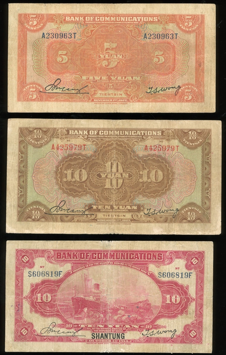 Bank of Communications, 2 pairs of 5 and 10 yuan, Tientsin and Shangtung, 1914 and 1925, serial number A230963T, A425979T, SA047812B, S606819F,