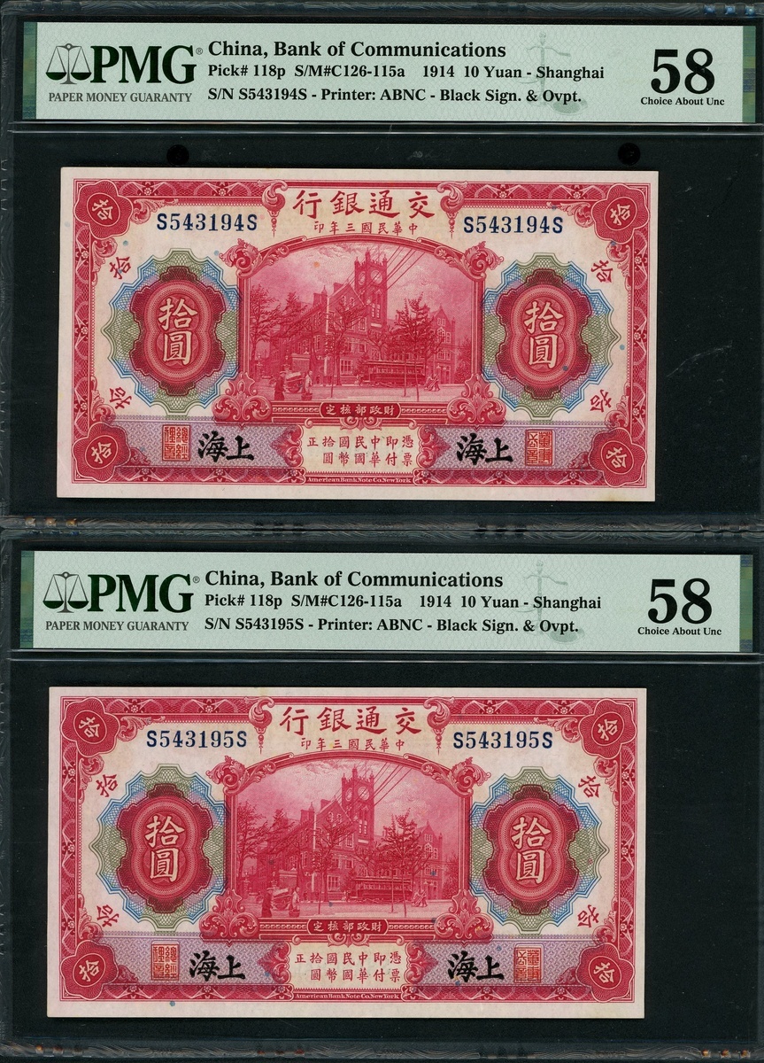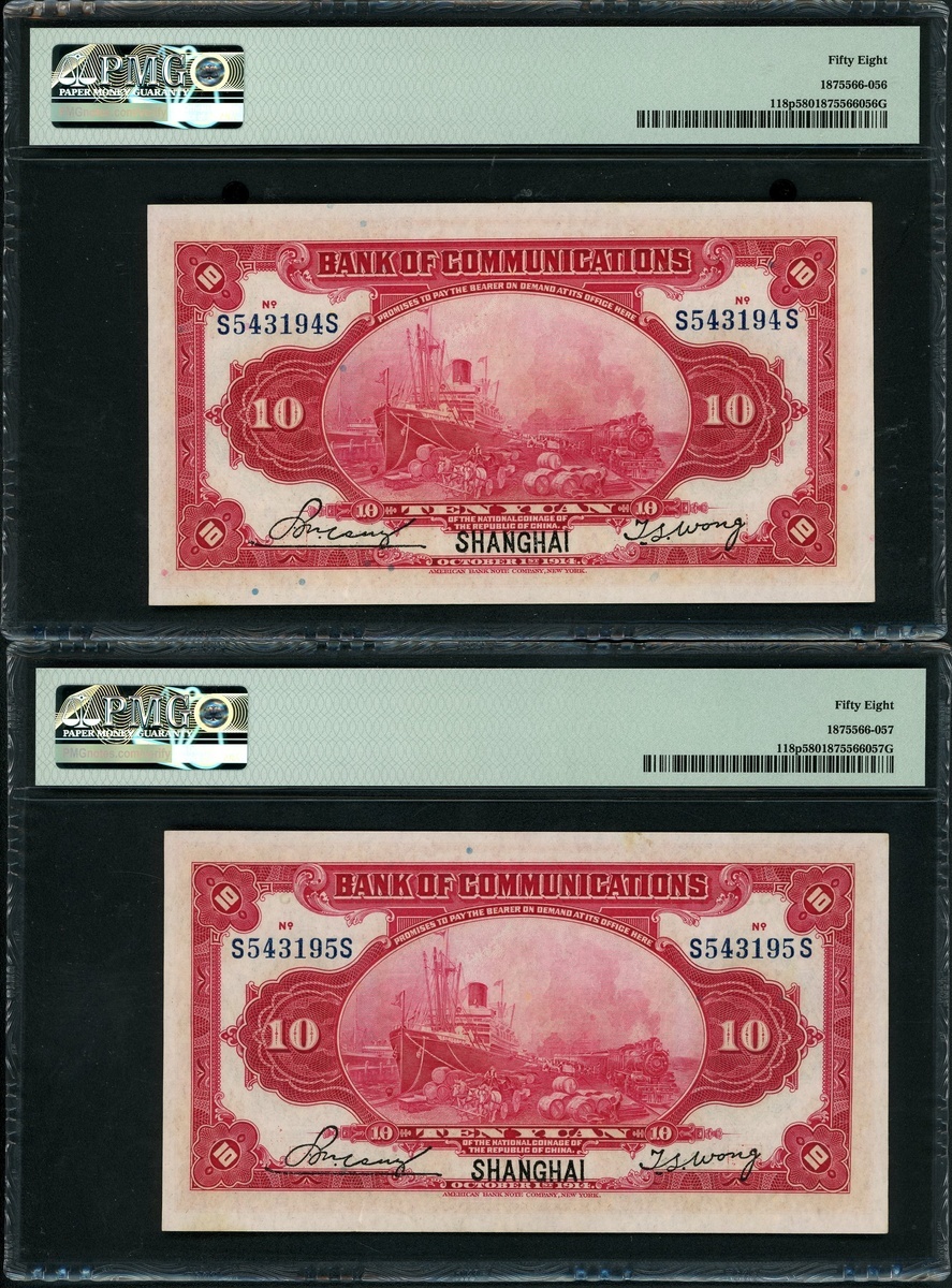 Bank of Communciations, a pair of 10 yuan, Shanghai, 1.10.1914, consecutive serial numbers S543194S-195S, (Pick 118p), both PMG 58 Choice About Uncirculated (2).