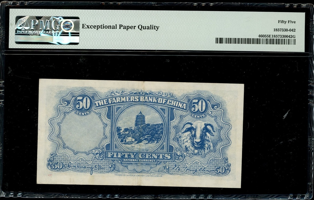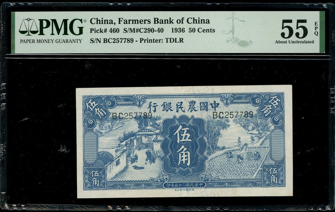 The Farmers Bank of China, 50 cents, 1936, serial number BC257789, (Pick 460), PMG 55EPQ, about uncirculated.