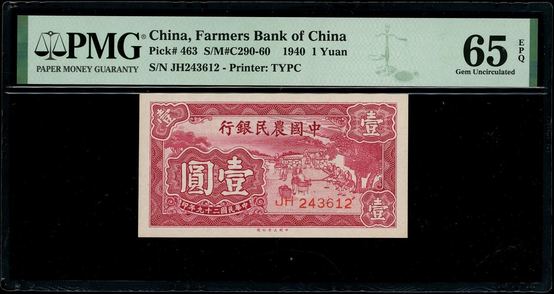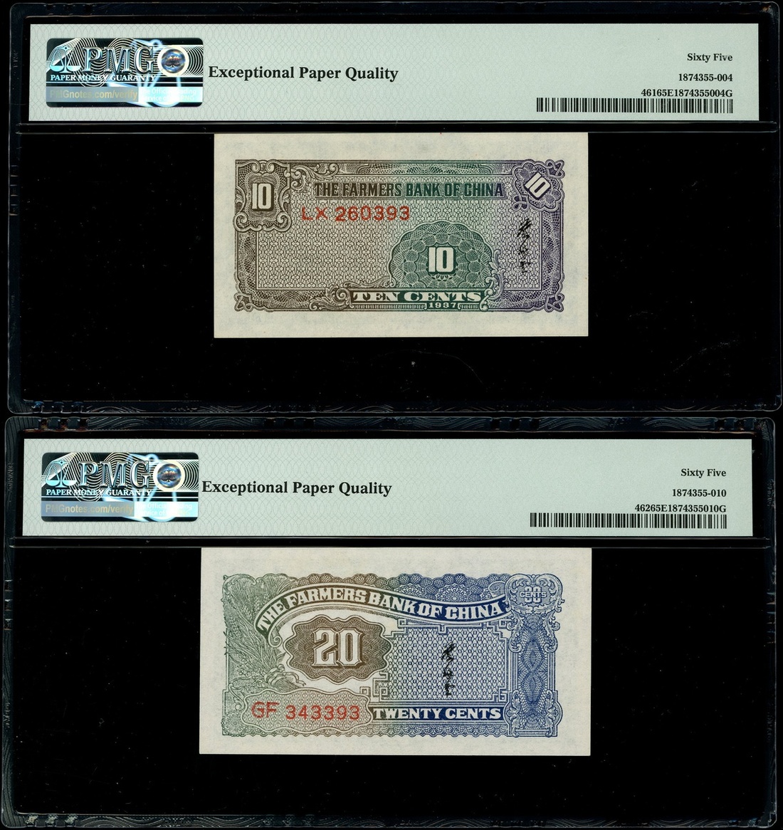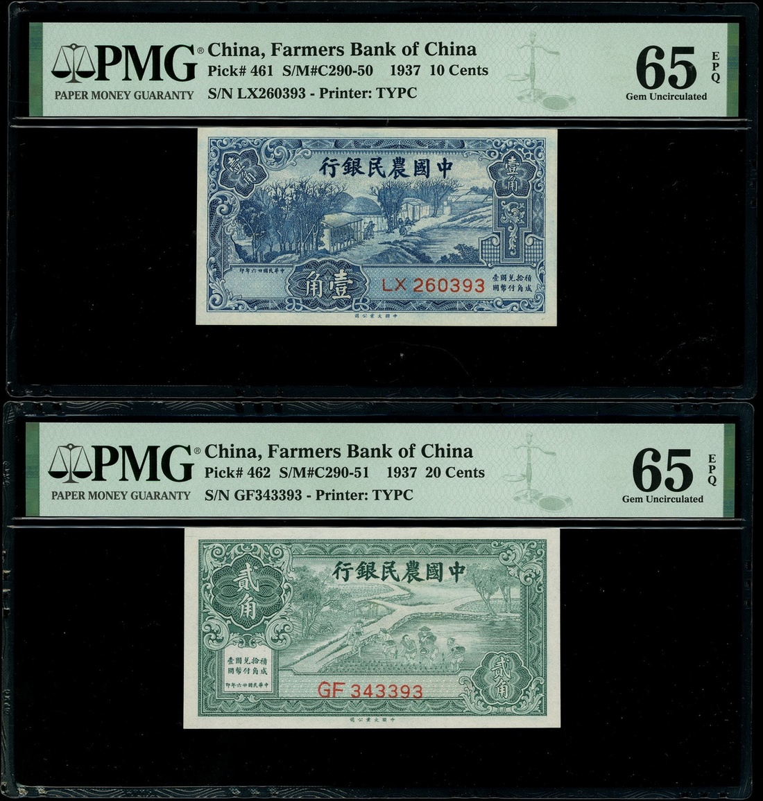 The Farmers Bank of China, 10 cents, 20 cents, 1937 and 1 Yuan, 1940, serial numbers LX 260393, GF343393 and JH243612, (Pick 461, 462, 463), all graded PMG 65EPQ Gem Uncirculated (3)