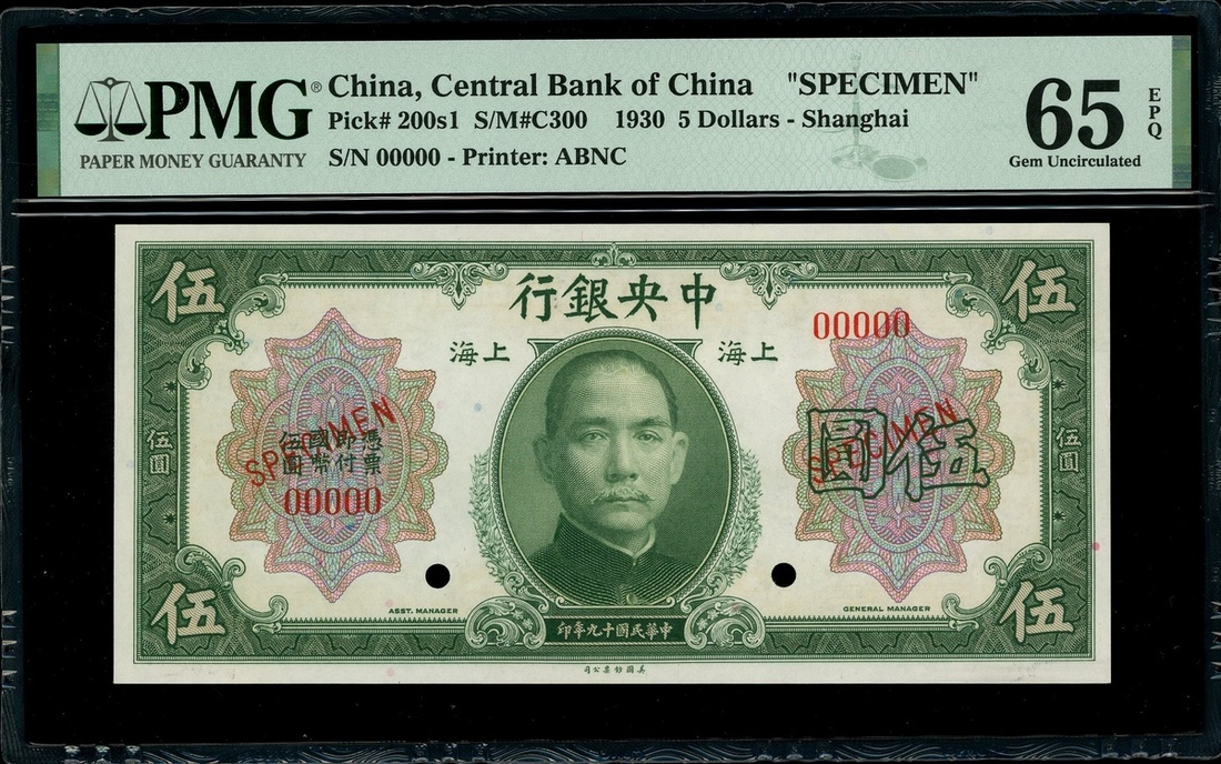 Central Bank of China, 5 yuan, Shanghai, specimen, Year 19 (1930), serial number 00000, (Pick 200s1), PMG 65EPQ Gem Uncirculated