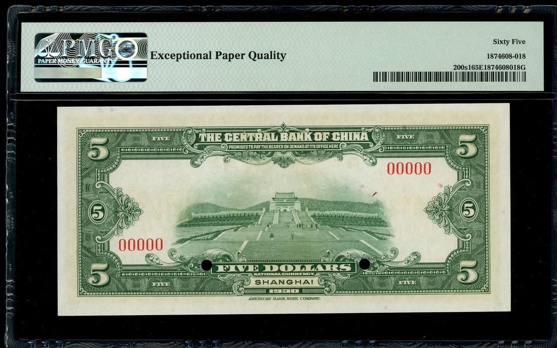 民國十九年(1930)中央銀行5元,上海地名,編號00000,PMG 65EPQ