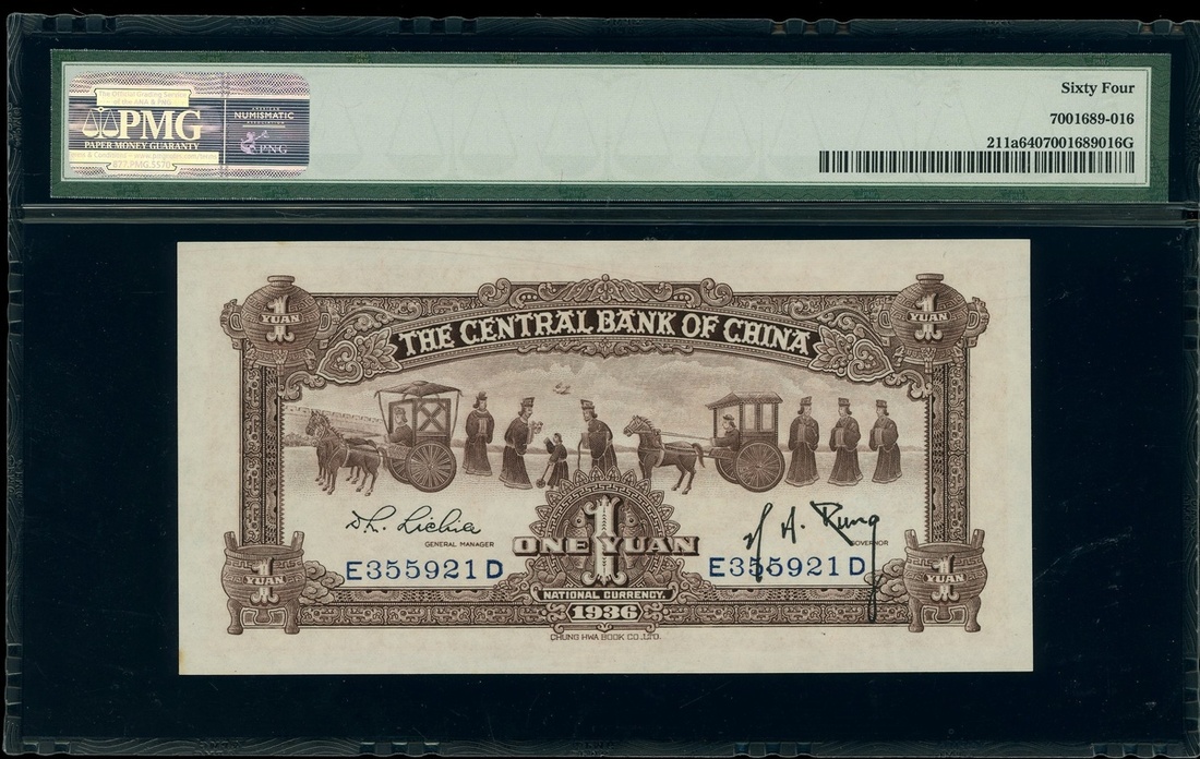 The Central Bank of China, 1 Yuan, 1936, serial number E355921D, (Pick 211a), PMG 64 Choice Uncirculated