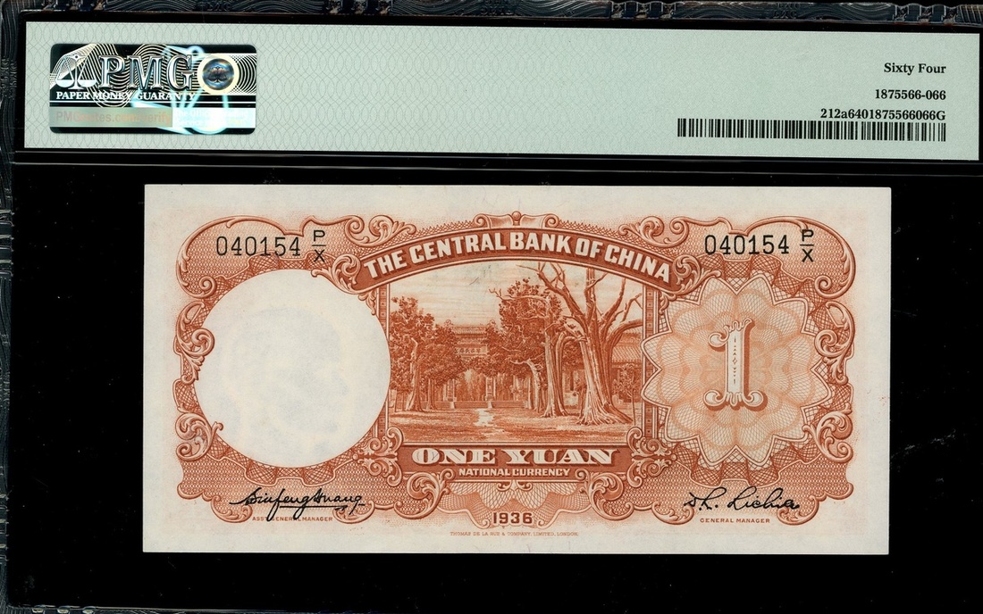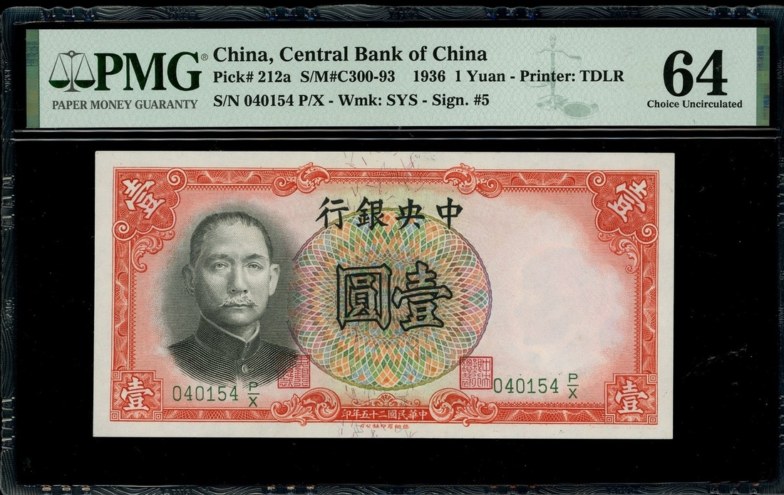 Central Bank of China, 1 yuan, Year 25 (1936), serial number 040154 P/X, (Pick 212a), PMG 64 Choice Uncirculated