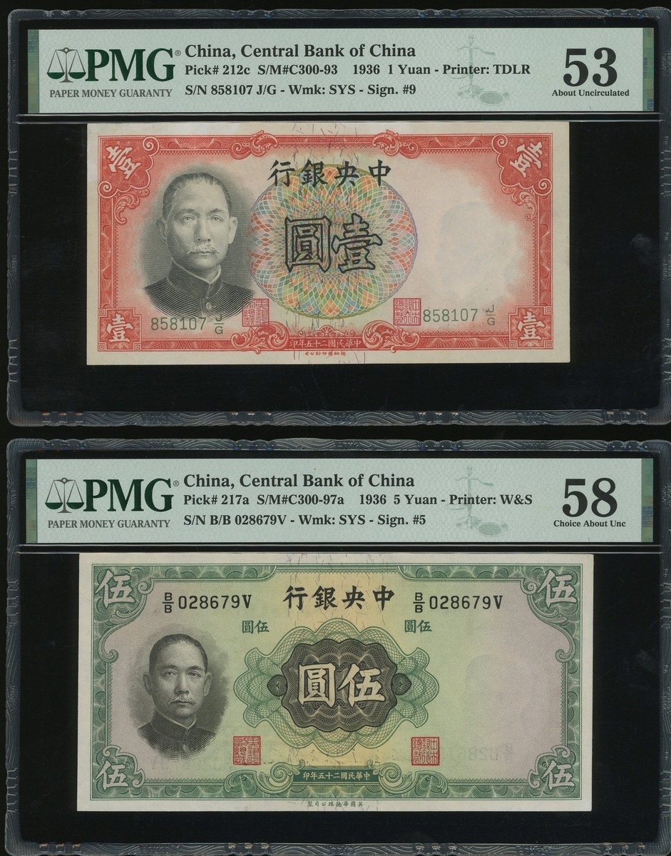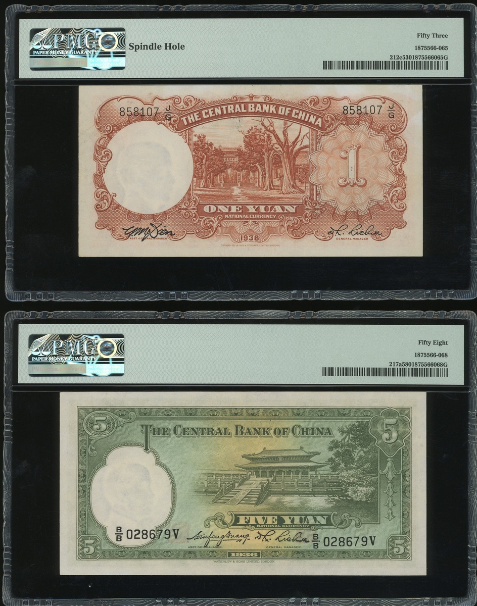 The Central Bank of China, a pair of 1 yuan and 5 yuan, 1936, serial numbers 858107 J/G and B/B 028679 V, (Pick 212c and 217a), graded PMG 53 About Uncirculated (Spindle Hole) and 58 Choice About Uncirculated (2).