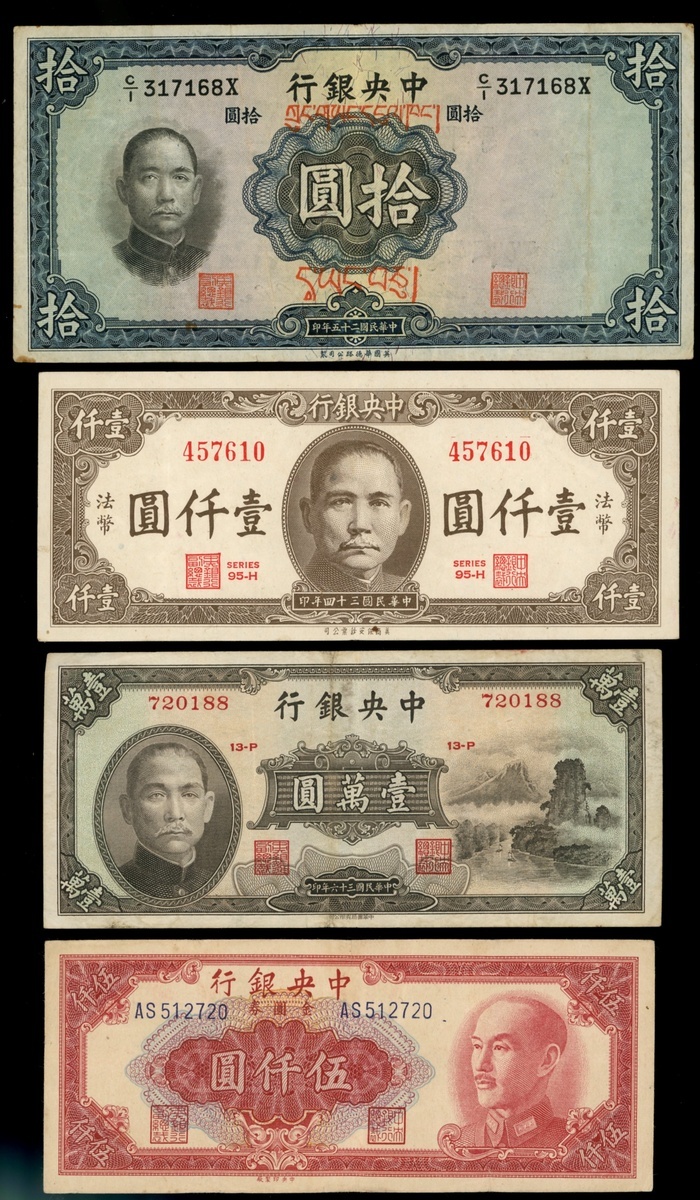 中央銀行一組4枚,包括民國二十五年(1936)10元,罕見藏文加蓋版別,編號 C/I 317168X,民國三十四年(1945)1000元,民國三十八年(1949)5000元,及民國三十六年(1947)10000元,皆VF品相,首枚罕見,值得珍視