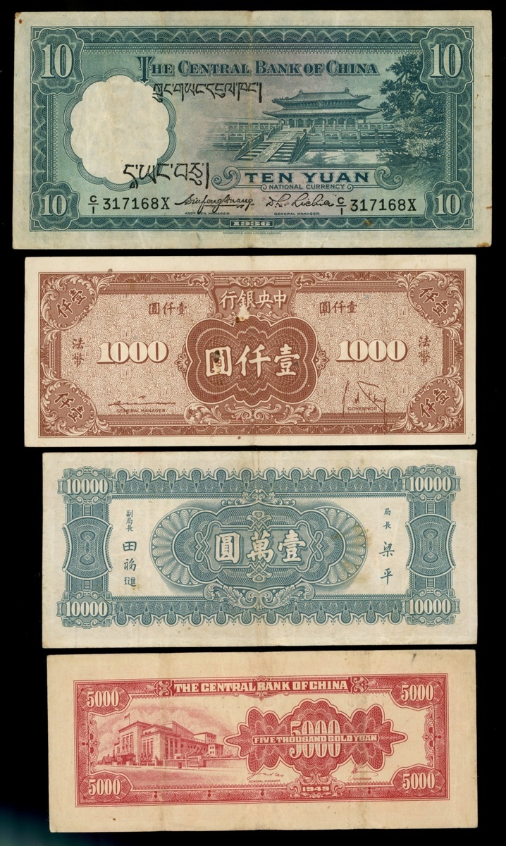 The Central Bank of China, 10 Yuan, 1936, serial number C/I 317168X, scarcer type with Tibetan characters overprinted, also 1000 Yuan, 1945, 5000 Yuan, 1949 and 10,000 Yuan, 1947, serial numbers 457610, AS512720 and 720188,