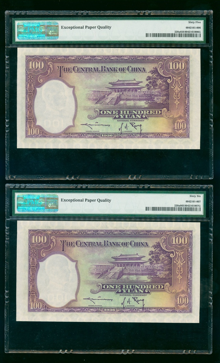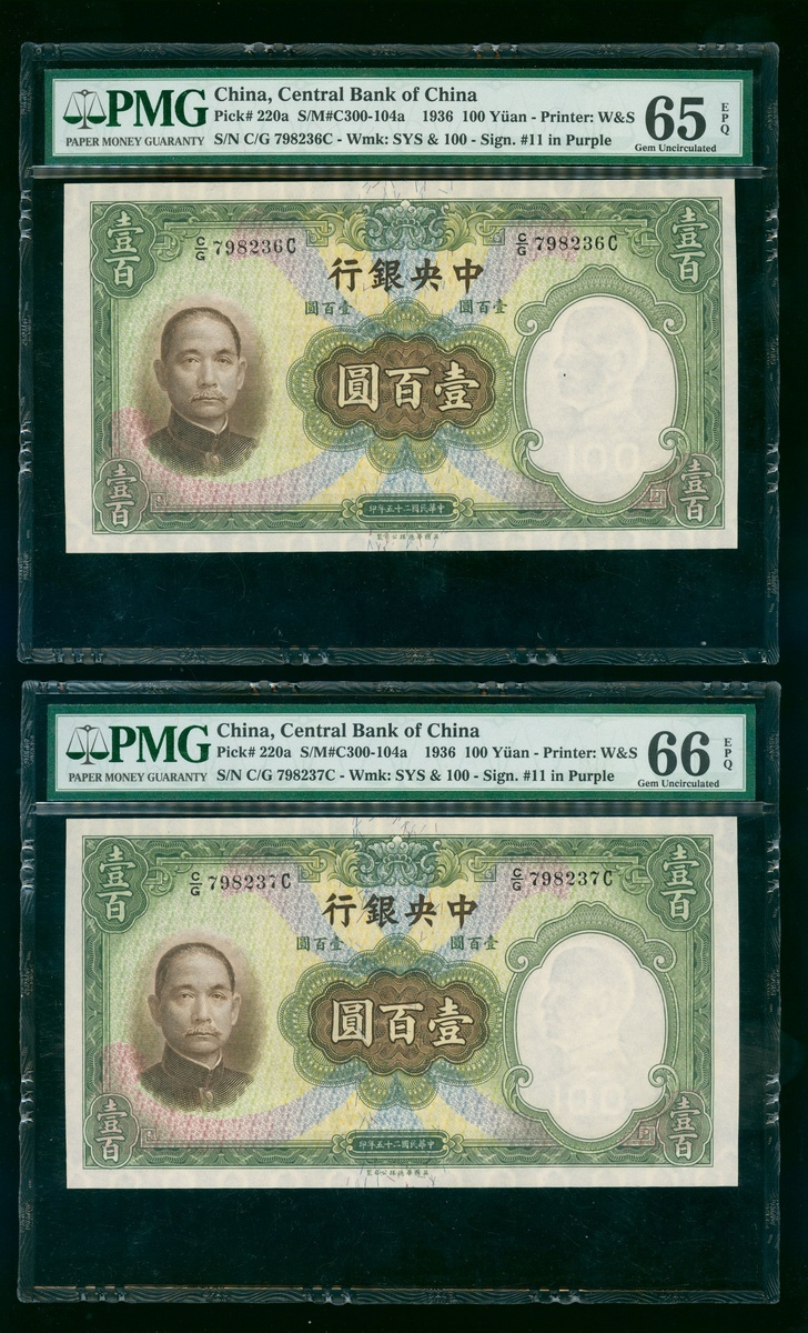 Central Bank of China, a consecutive pair of 100 yuan, 1936, serial numbers C/G 798236C-37C, (Pick 220a), graded PMG 65EPQ and 66EPQ respectively (2).
