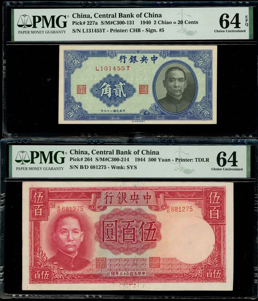 中央銀行民國二十九年(1940)2毫及民國三十三年(1944)500元,編號 L131455T,及B/D681275,分別評PMG 64EPQ及64