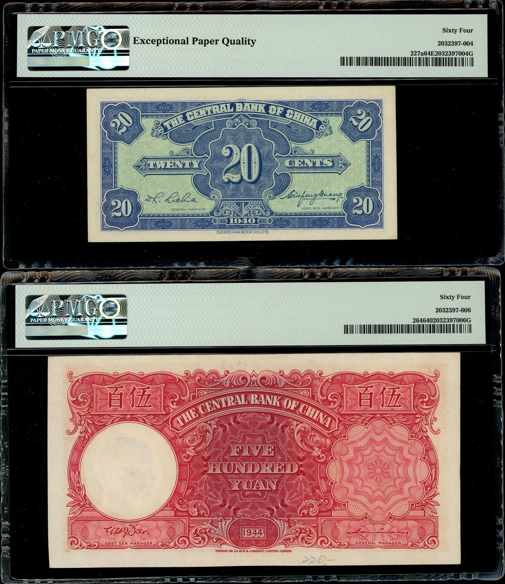 Central Bank of China, 20 cents and 500 yuan, 1940 and 1944, serial number L131455T, B/D681275, (Pick 227a, 264), PMG 64EPQ and 64 respectively.