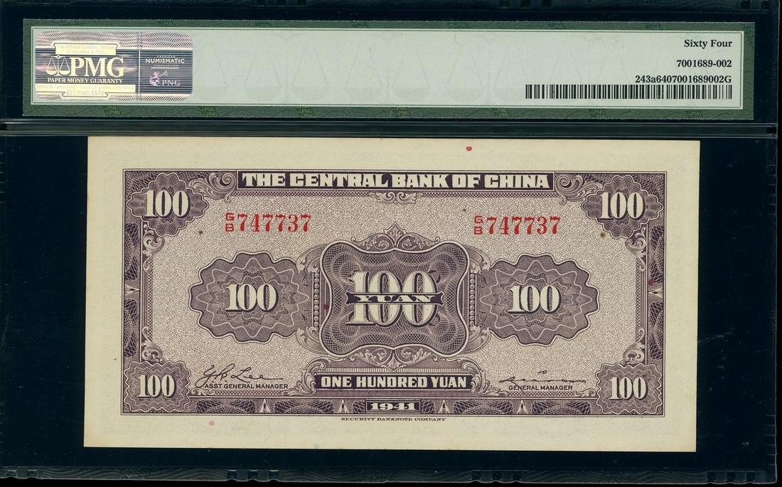 The Central Bank of China, 100 Yuan, 1941, serial number G/B 747737, (Pick 243a), PMG 64 Choice Uncirculated