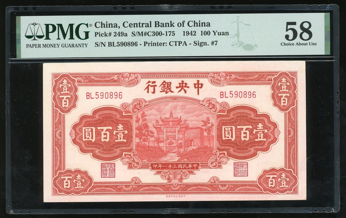 The Central Bank of China, 100 Yuan, 1942, serial number BL 590896, (Pick 249a), PMG 58 Choice About Uncirculated.