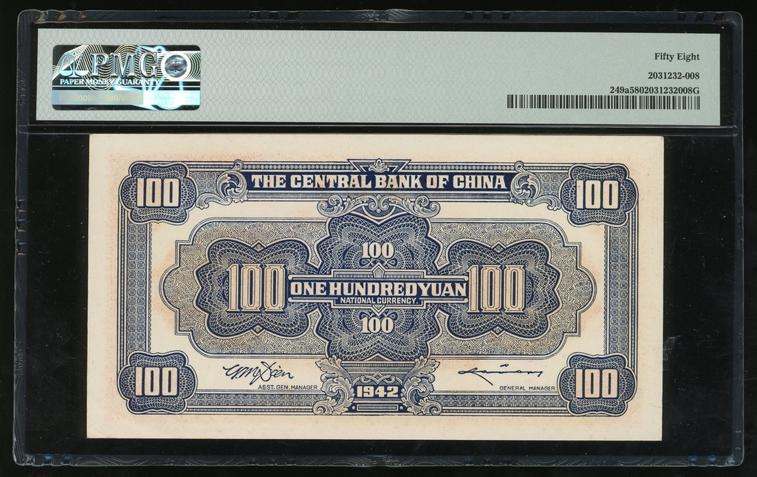 民國三十一年(1942)中央銀行100元,編號BL 590896,PMG 58
