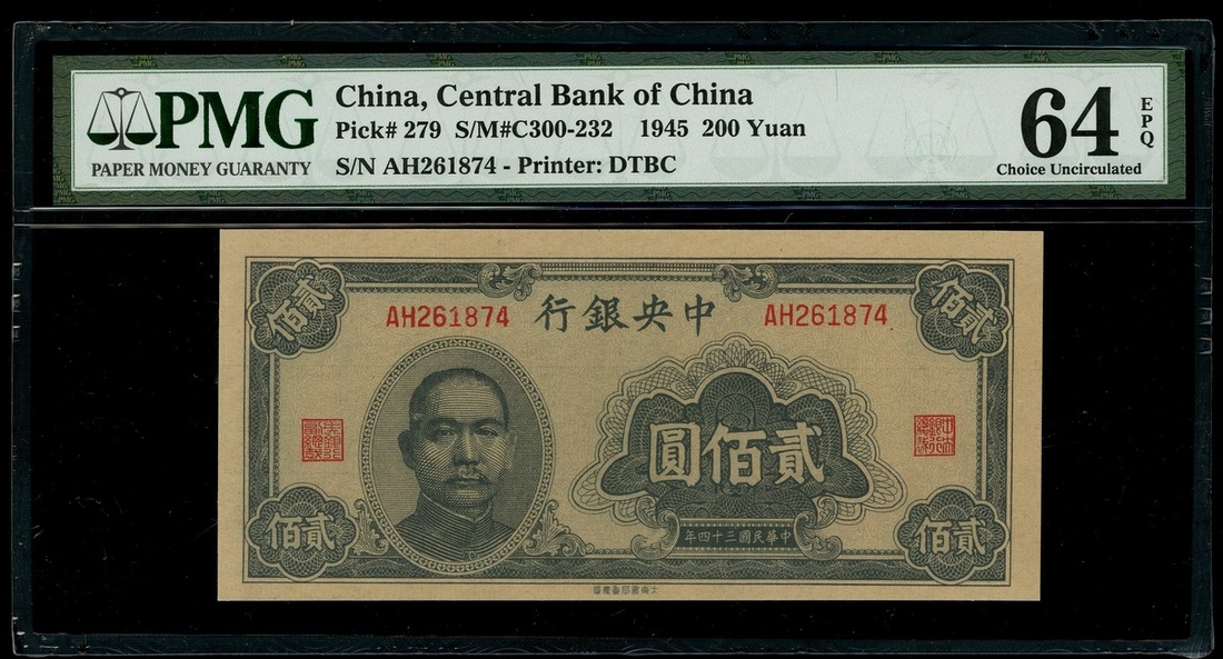 Central Bank of China, 200 yuan, 1945, serial number AH261874, (Pick 279), PMG 64EPQ.
