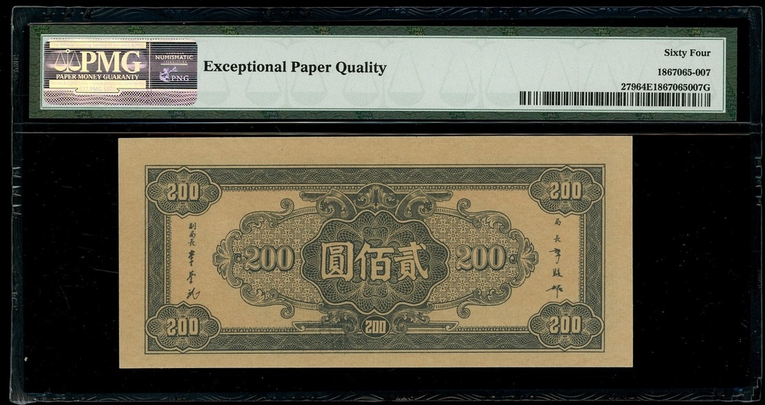 民國三十四年(1945)中央銀行200元,編號AH261874,PMG 64EPQ