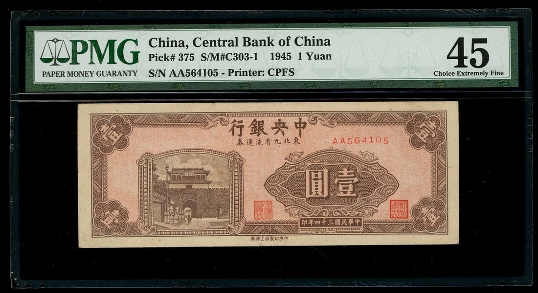Central Bank of China, 1 yuan, 1945, serial number AA564105, (Pick 375), PMG 45, choice extremely fine.