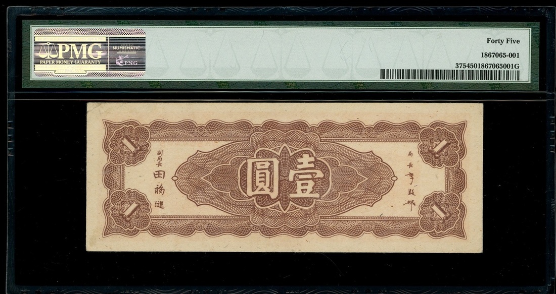 民國三十四年(1945)中央銀行1元,編號AA564105,PMG 45