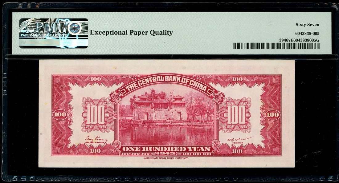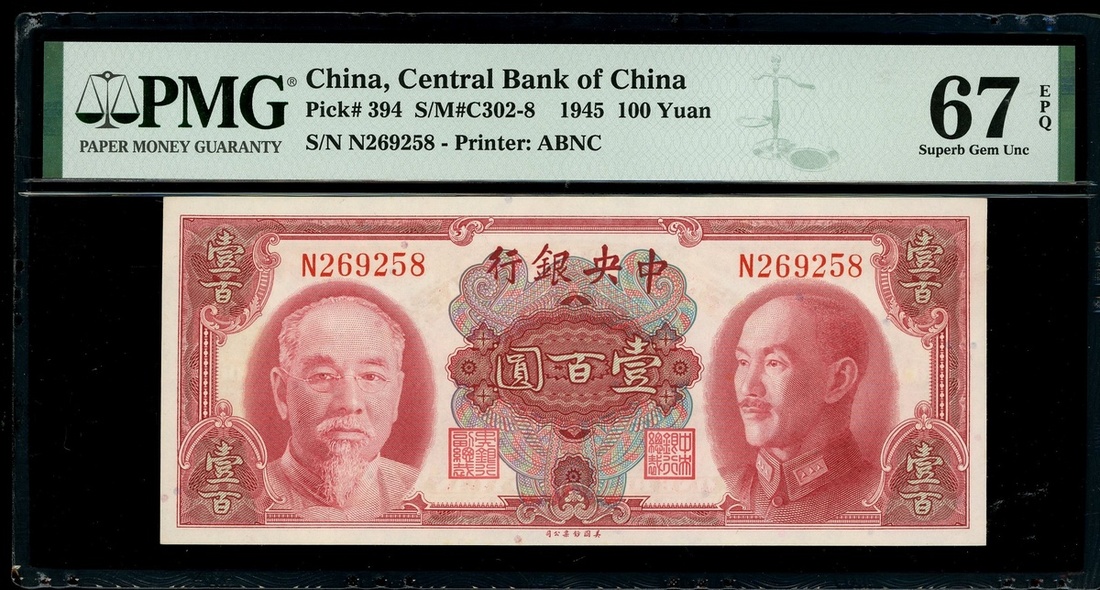 Central Bank of China, 100 yuan, 1945, serial number N269258, (Pick 394), PMG 67EPQ, superb gem uncirculated.