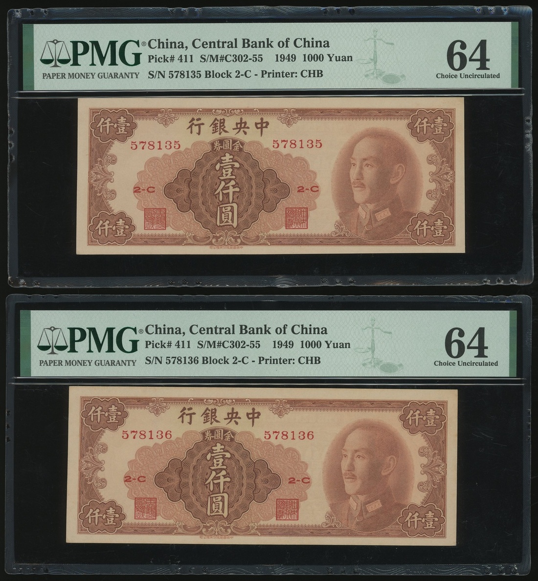 民國三十八年(1949)中央銀行金圓券1000元連號一對,編號 578135-36 2-C,中華書局版,均PMG 64
