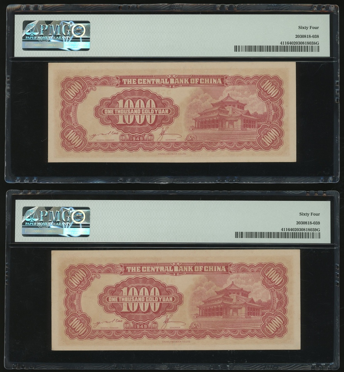 Central Bank of China, a consecutive pair of 1,000 gold yuan, 1949, serial number 578135-36 2-C, printed by Chung Hwa Book,