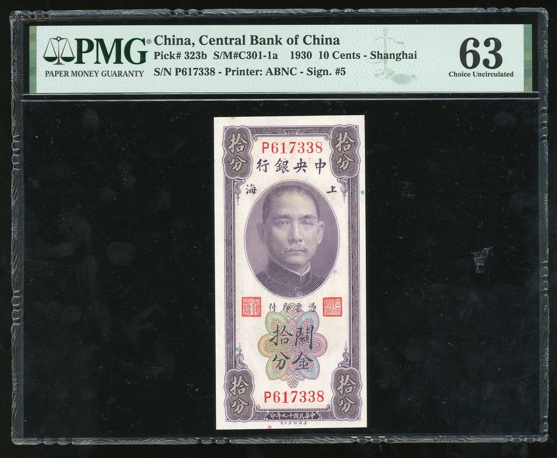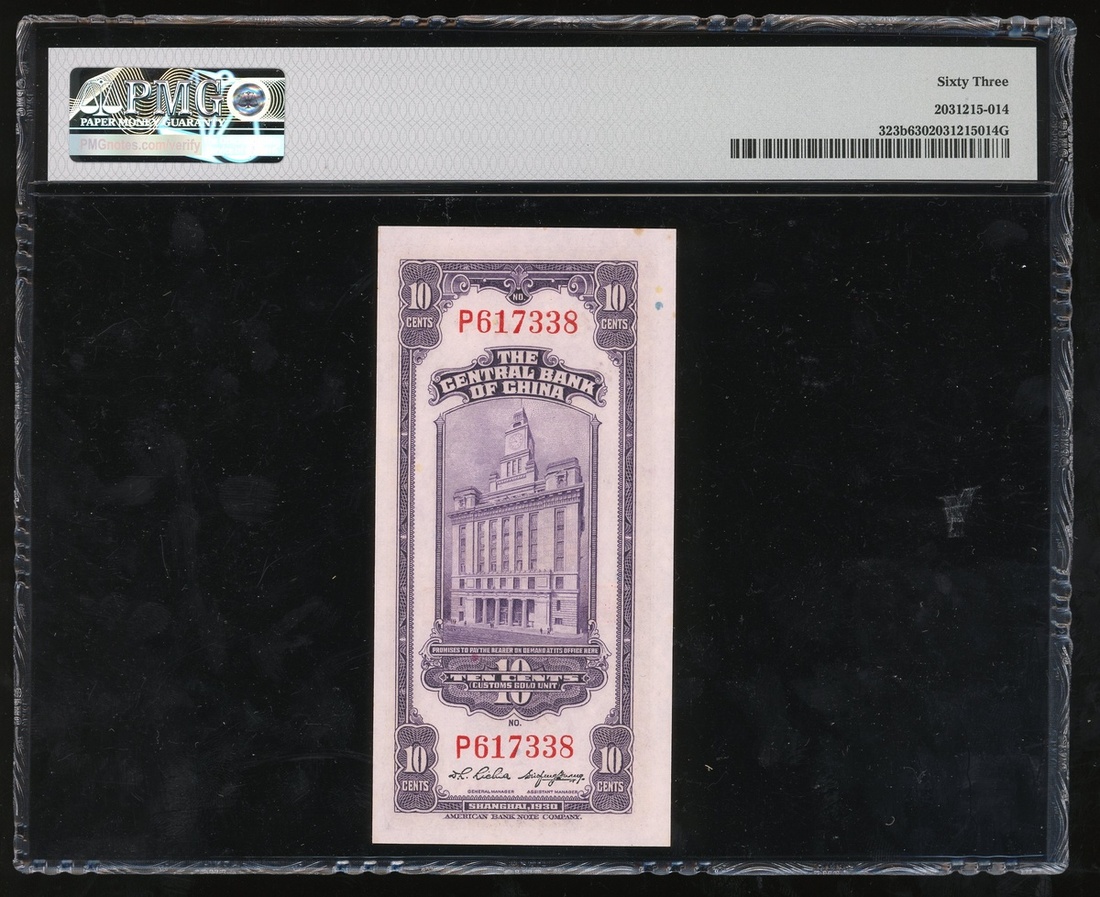 民國十九年(1930)中央銀行關金十分,上海地名,編號P617338,直版,PMG 63,紙邊有微黃