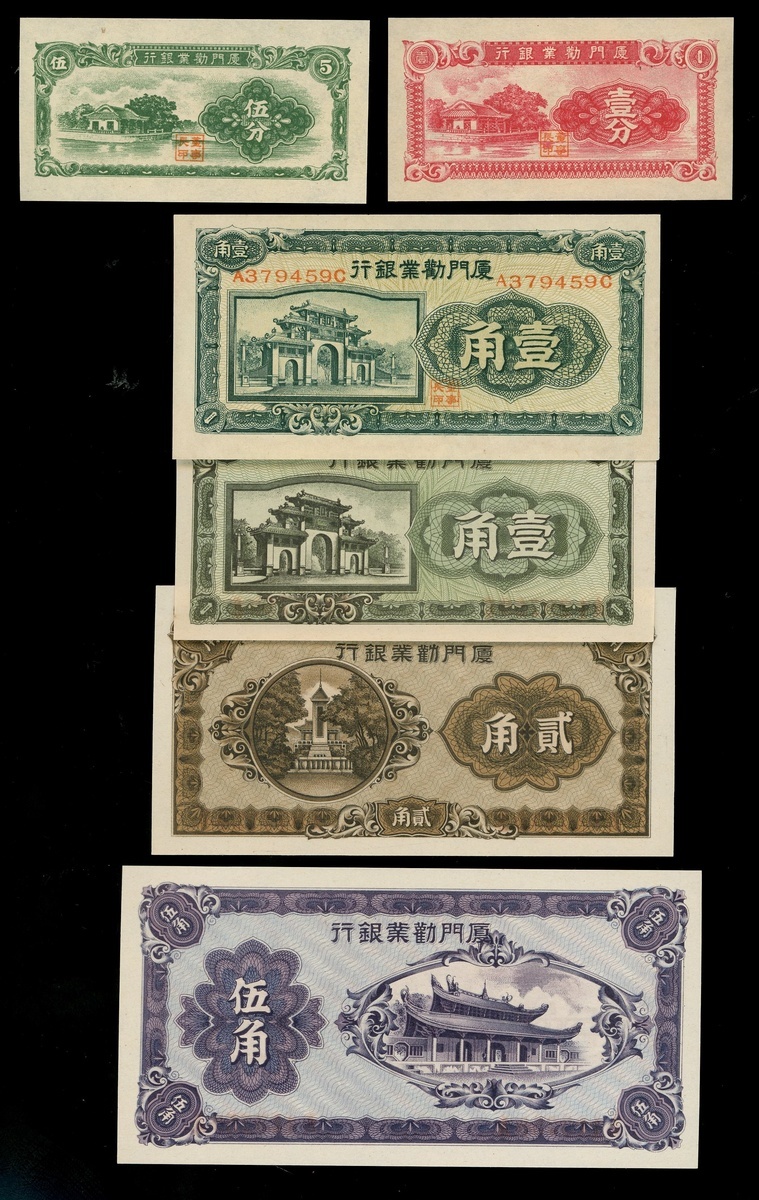 廈門勸業銀行一組6枚,一分,五分,一角(2枚),二角及五角,一分及五分無編號,一角 A129759C,A379459C,二角A017759B,五角A113759A,UNC