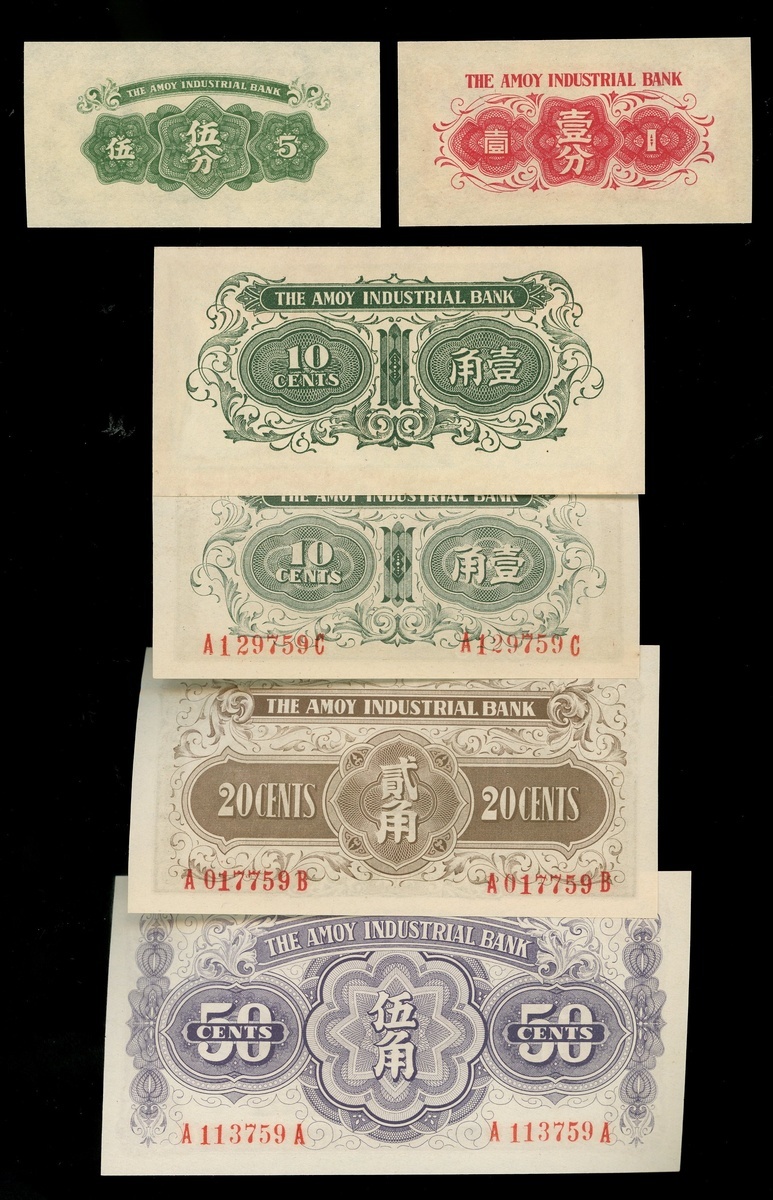 The Amoy Industrial Bank, a set of 1, 5 fen, 2x 10, 20 and 50 cents, ND, 1 and 2 fen without serial number, 10 cents A129759C, A379459C, 20 cents A017759B, 50 cents A113759A,