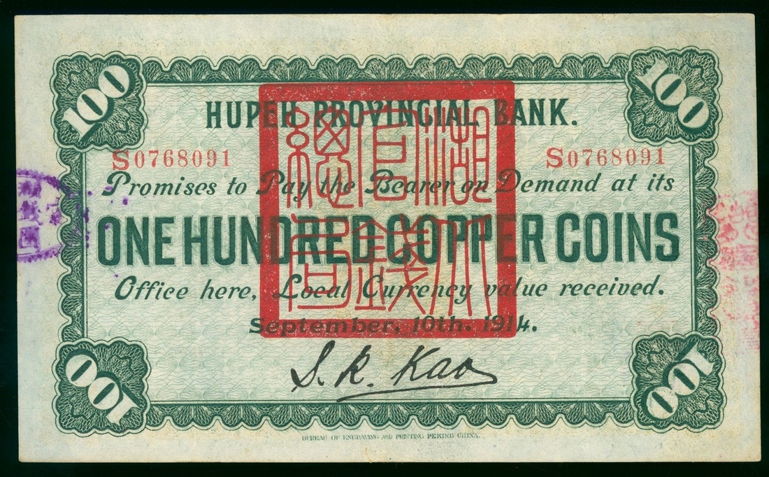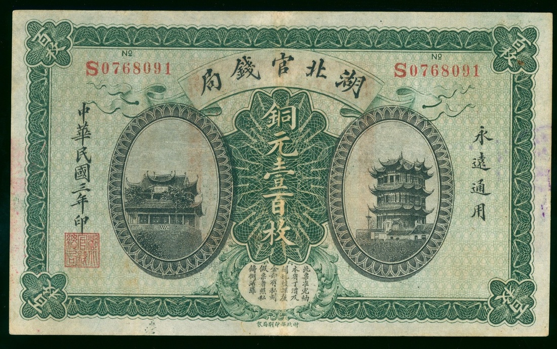 Hupeh Currency Bureau, 100 copper coins, 1914, serial number S0768091, (Pick S2098), extremely fine