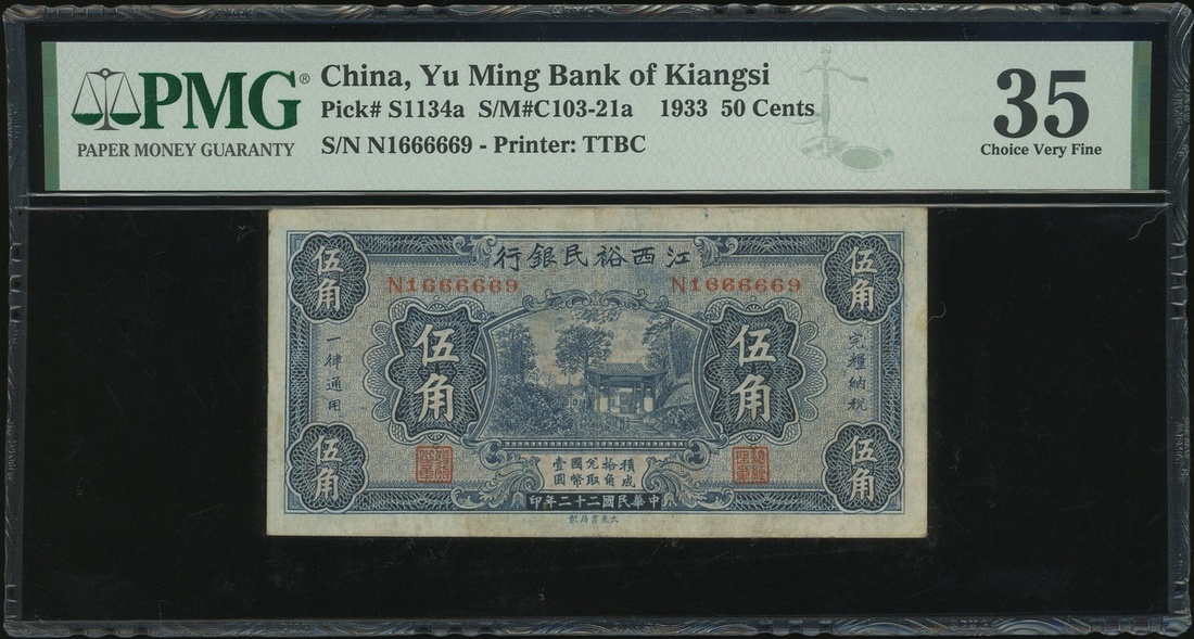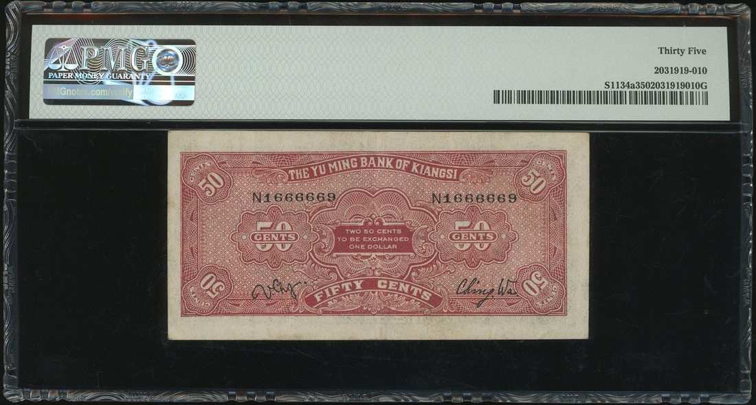 Yu Ming Bank of Kiangsi, 50 cents, 1933, serial number N1666669, (Pick S1134a), PMG 35 choice very fine.