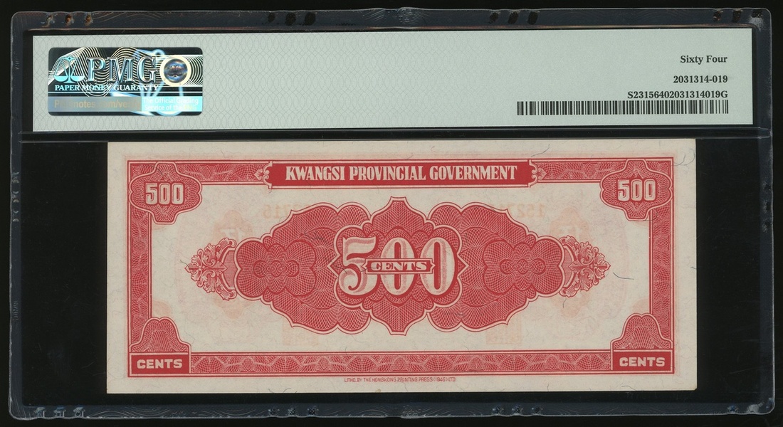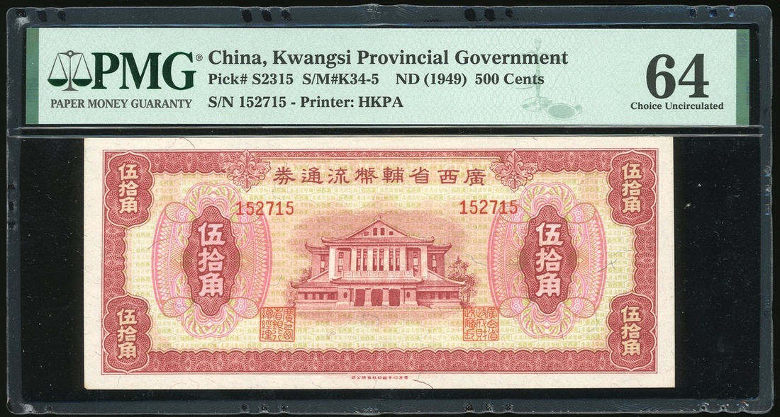 Kwangsi Provincial Government, 500 cents, 1949, serial number 152715, (Pick S2315), PMG 64 Choice Uncirculated
