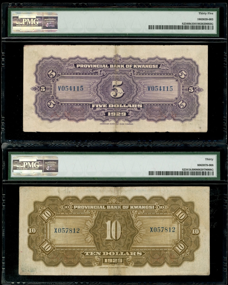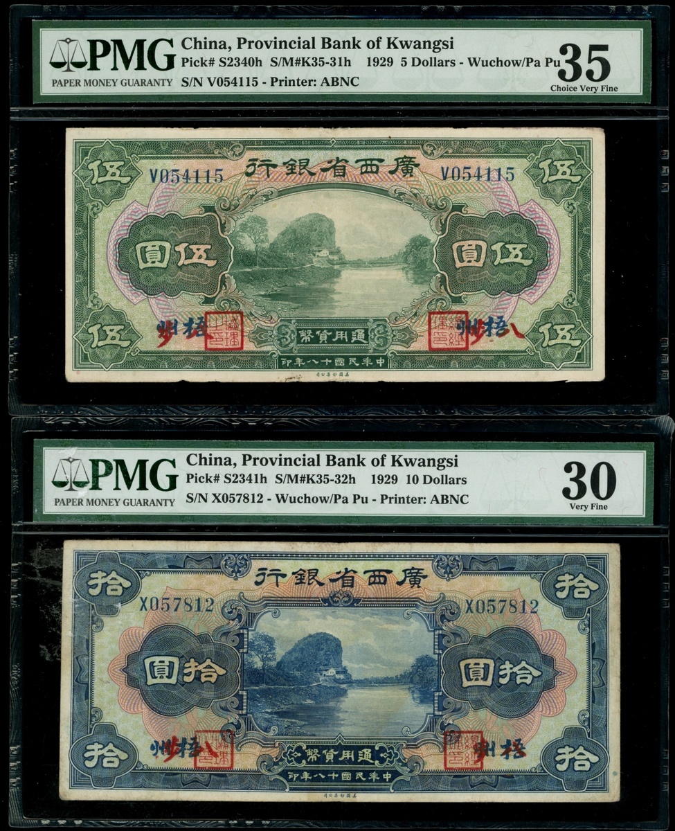 Provincial Bank of Kwangsi, a pair of $5 and $10, 1929, Wu Chow/Pa Pu, serial numbers V054115 and X057812, (Pick S2340h, S2341h), graded PMG 35 and 30 respectively, a scarcer place name of issue. (2)
