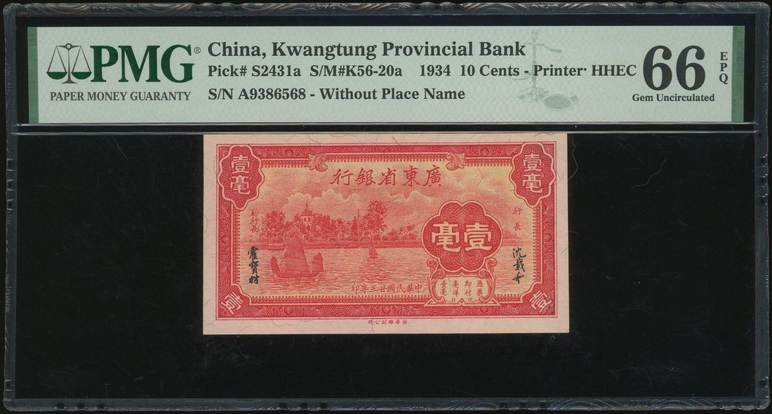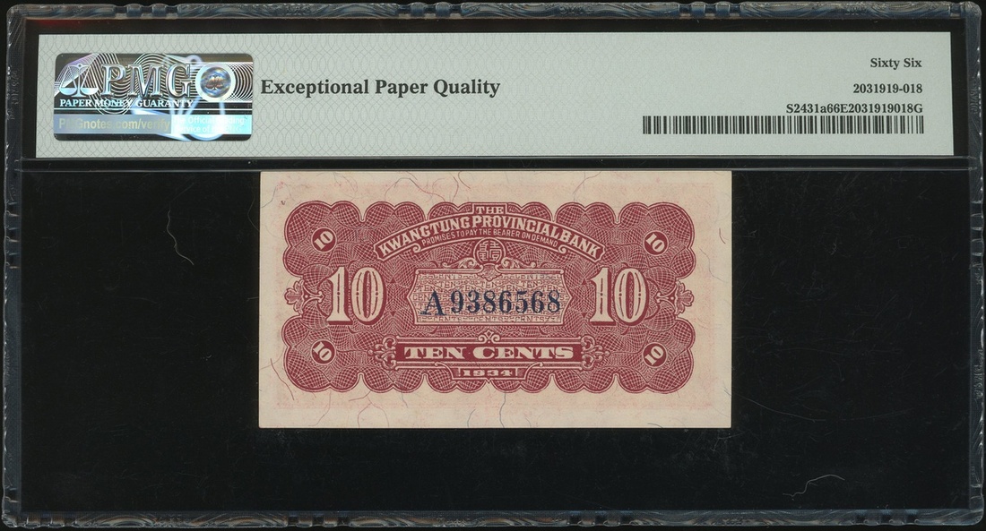 Kwangtung Provincial Bank, 10 cents, 1934, serial number A9386568, (Pick S2431a), PMG 66EPQ, gem uncirculated.